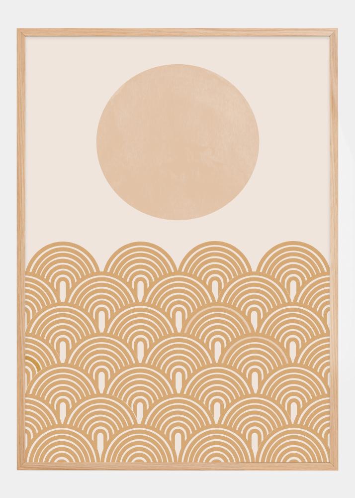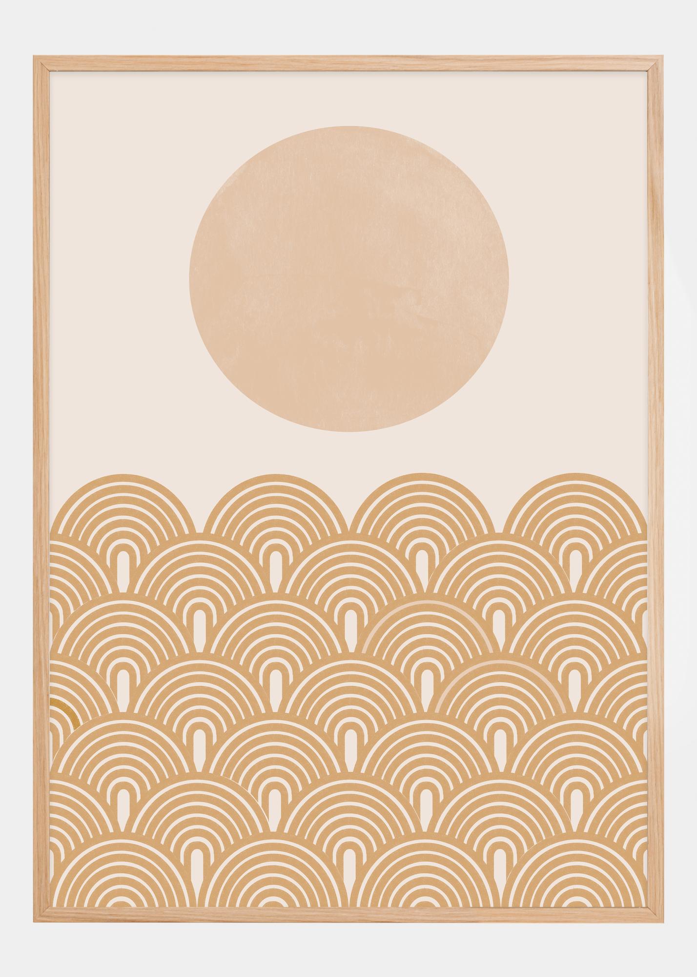 Táto plagát je slnečnou interpretáciou retro štýlov a letných vibrácií, kde veľký bledoružový kruh sa vznáša nad vzorom oblúkových prvkov v teplej terakotovej tóne. Oblúky sú prepojené spôsobom, ktorý pripomína vlny alebo kopce, čo dodáva pocit pohybu a živosť. Jemná farebná schéma prispieva k pocitu tepla a pokoja.