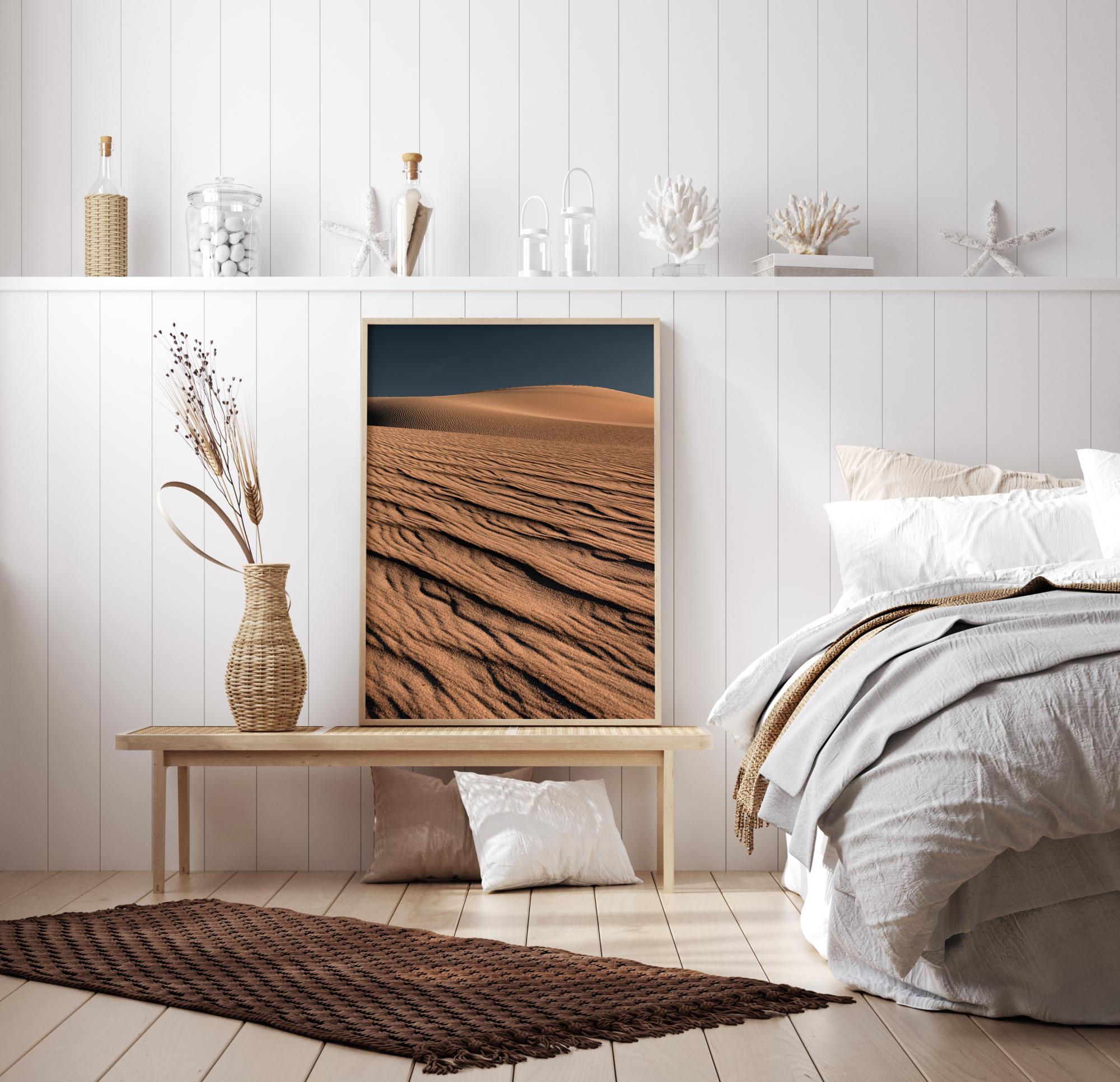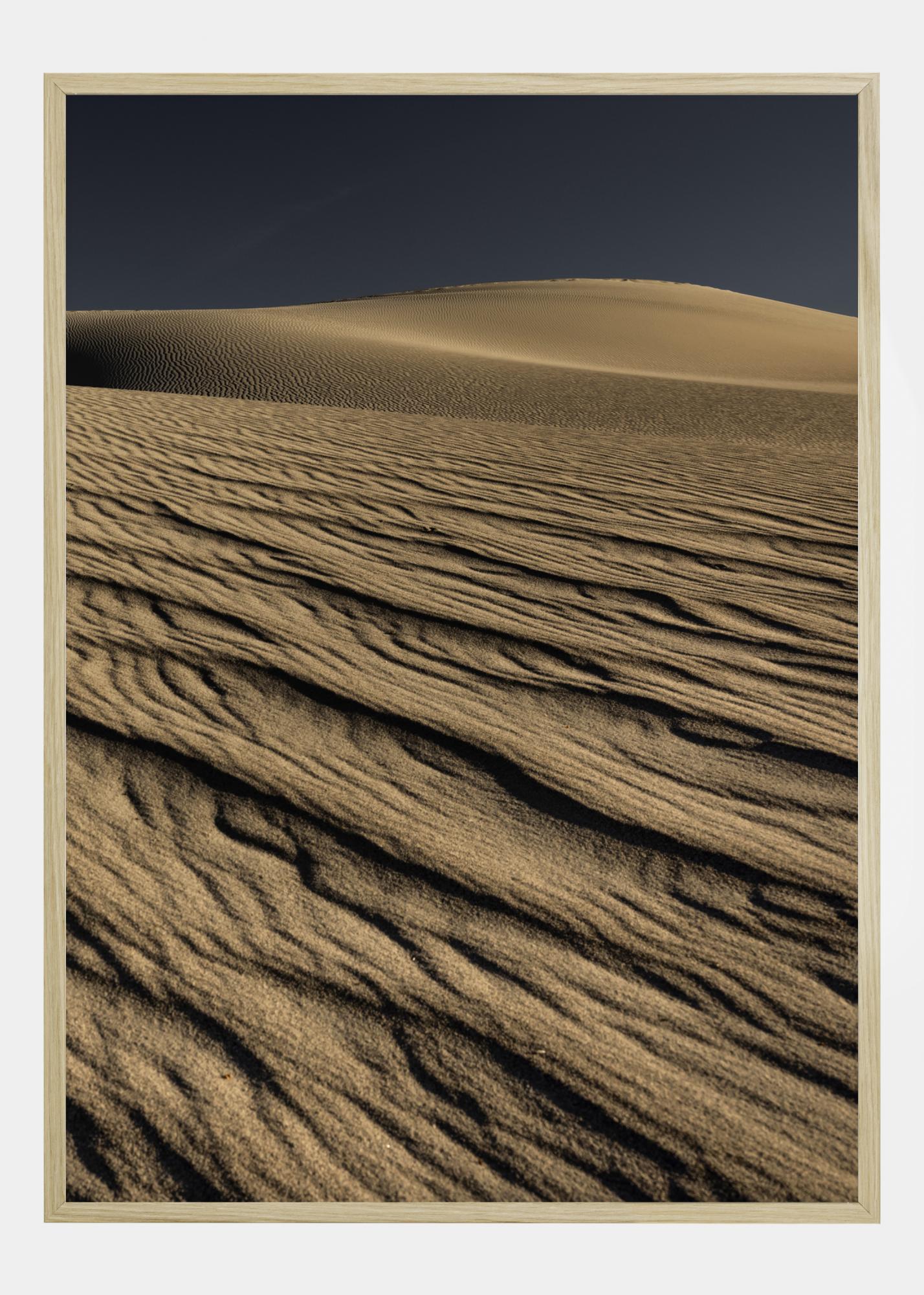 Dramatický plagát s vlnami piesku na piesočných dunách. Táto úžasná fotografia vytvára harmóniu s kontrastným žltým pieskom a modrou oblohou. Kúpte si trochu dramatiky a nechajte svoj pohľad cestovať cez tento obraz.