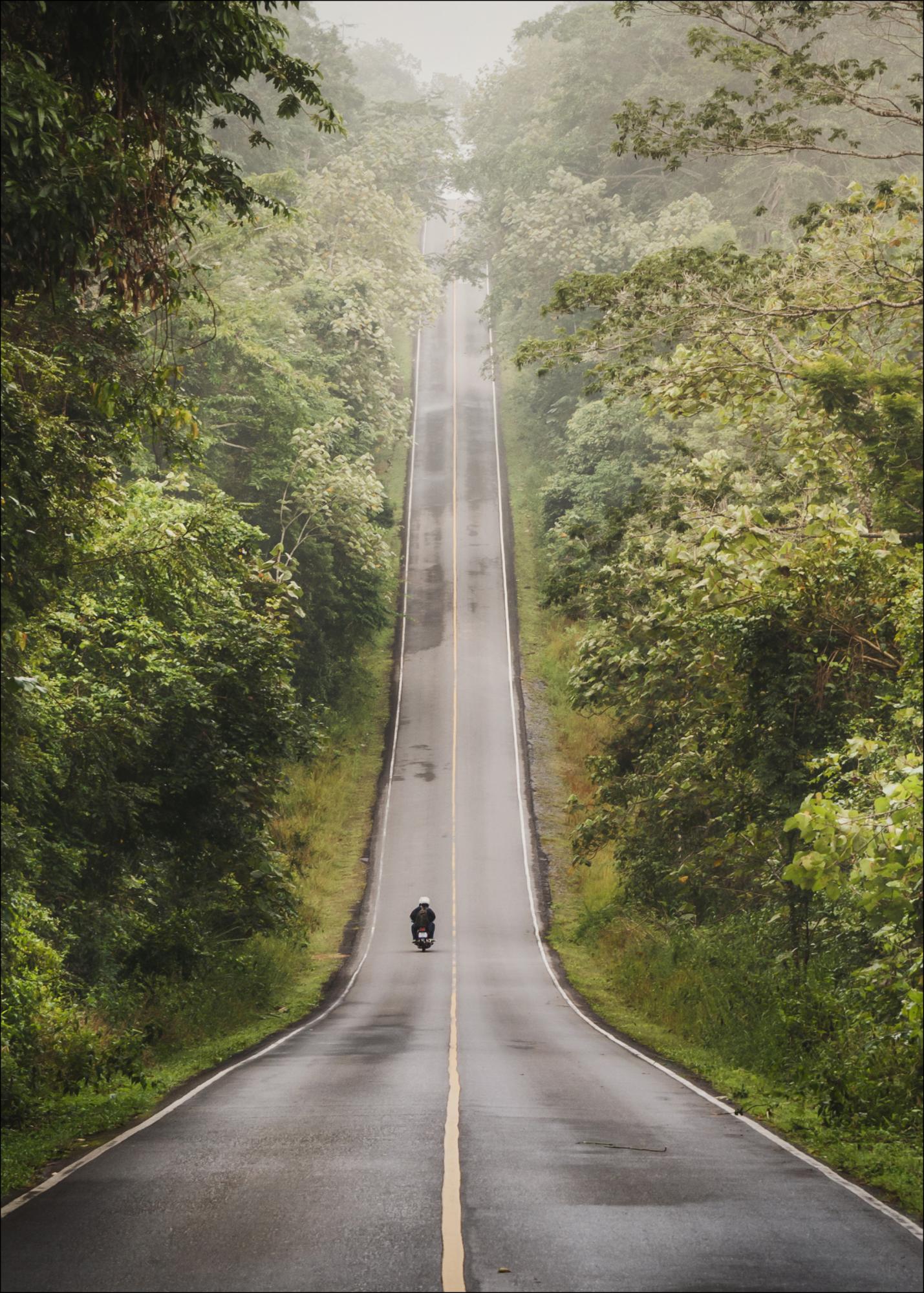 Tichá prírodná fotografia cesty s osamelým motorkárom, ktorý prechádza nádhernou sviežou zeleňou. Pokojný a upokojujúci plagát, ktorý vyzerá vynikajúco spolu s ďalšími obľúbenými na väčšej stene s obrazmi.