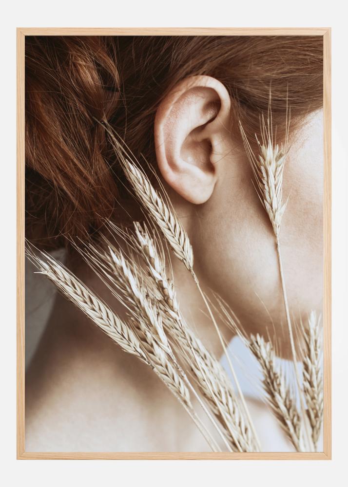 Profilový obrázok tváre ženy s niekoľkými klasmi pšenice. Jej červené vlasy a svetlá pleť vyvolávajú pocit, že je lesnou bohyňou. Tento plagát dokonale ladí, keď máte doma žatvu.