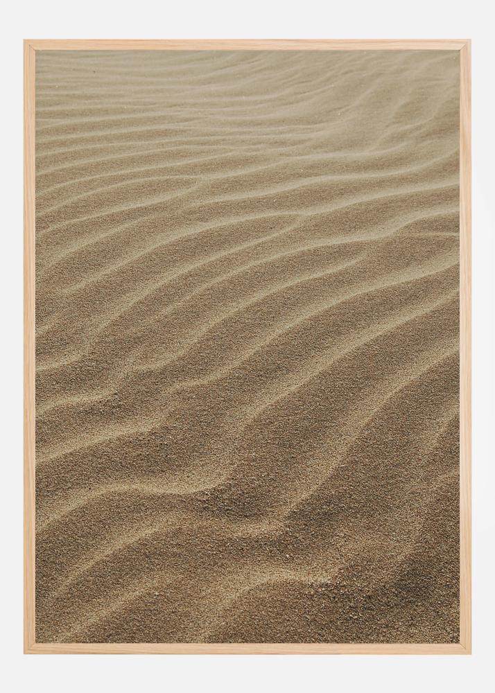 Jednoduchý plagát s vlnkami v piesku. Piesok pokračuje a pokračuje a vyplňuje celý obraz. Zblízka môžete vidieť zrnká piesku vo vetrom vytvorených potokoch na púšti. Obdivujte zázraky prírody na tomto úžasnom obraze.