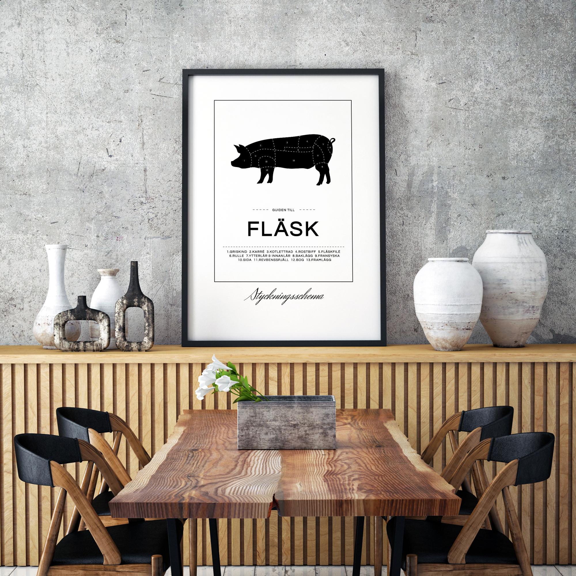 Nie sú to len mäsiari, ktorí môžu dať si štýlový rozpis porcií na stenu. Tu máme čiernobiely plagát s potlačou znázorňujúcou prasa s označeniami ukazujúcimi, kde nájdete rôzne bravčové lahôdky. Pod prasaťom je vytlačený text "Sprievodca bravčovinou" spolu s pekným zoznamom častí prasaťa. Textové úseky sú oddelené dvoma čiarkovanými čiarami a motív je obklopený jednoduchým štvorcom. Pod štvorcom je text "Rozpis porcií" napísaný ozdobným písmom.