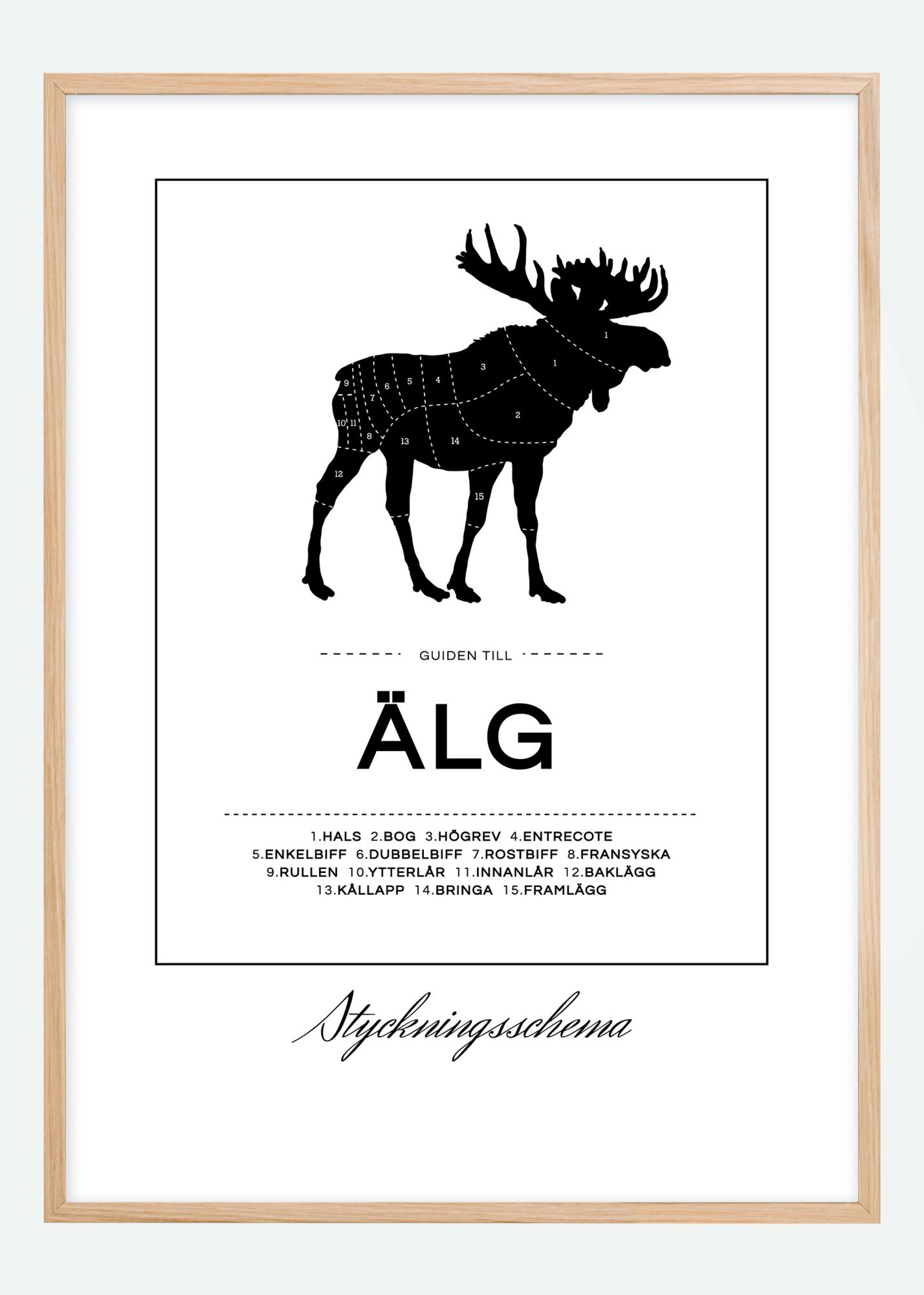 Plagát s časťami losa, ktoré tvoria najchutnejšie kusy mäsa. Čierny štylizovaný obrázok losa je umiestnený uprostred obrazu, biele čiary ho rozdeľujú a označujú rôzne časti na švédčine. Zaveste ho na viditeľné miesto pre veselé a neobvyklé doplnenie kuchyne, ktoré môže vyvolať niekoľko smiechov.