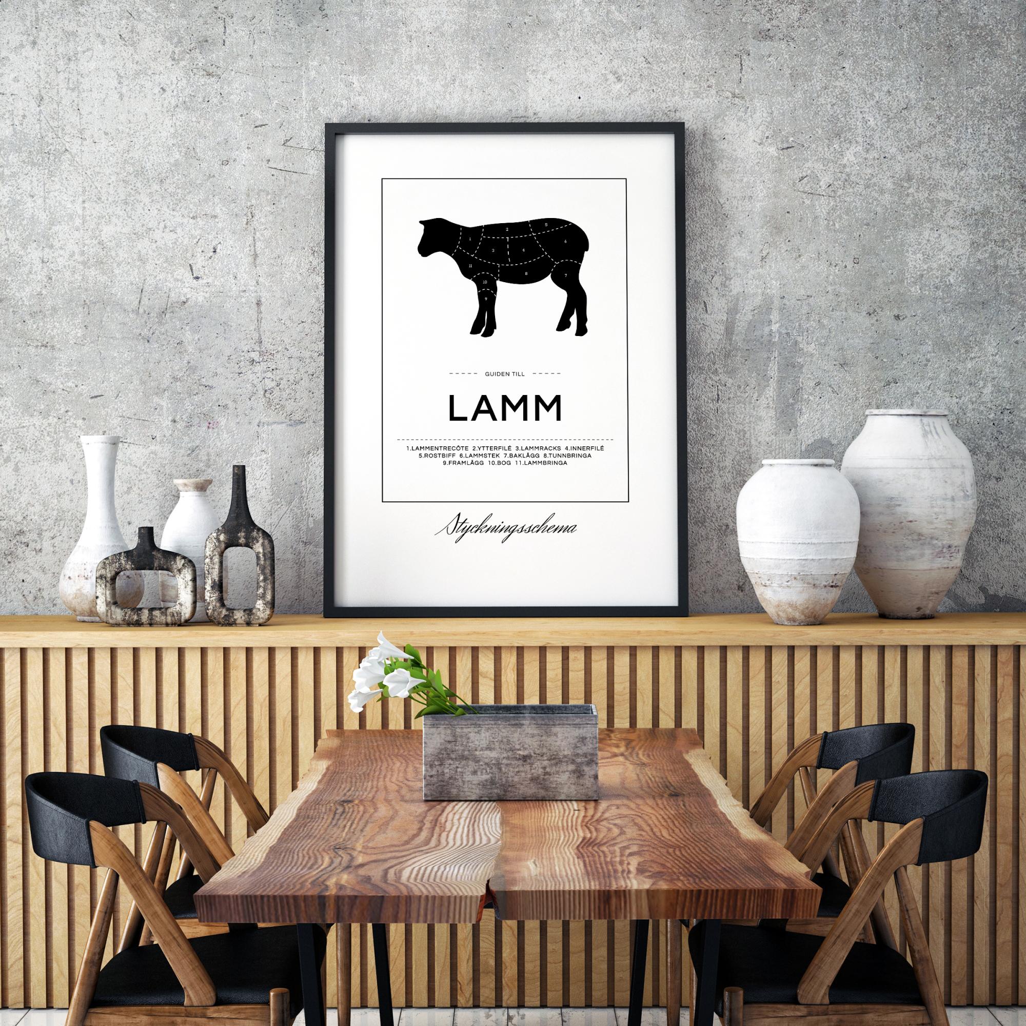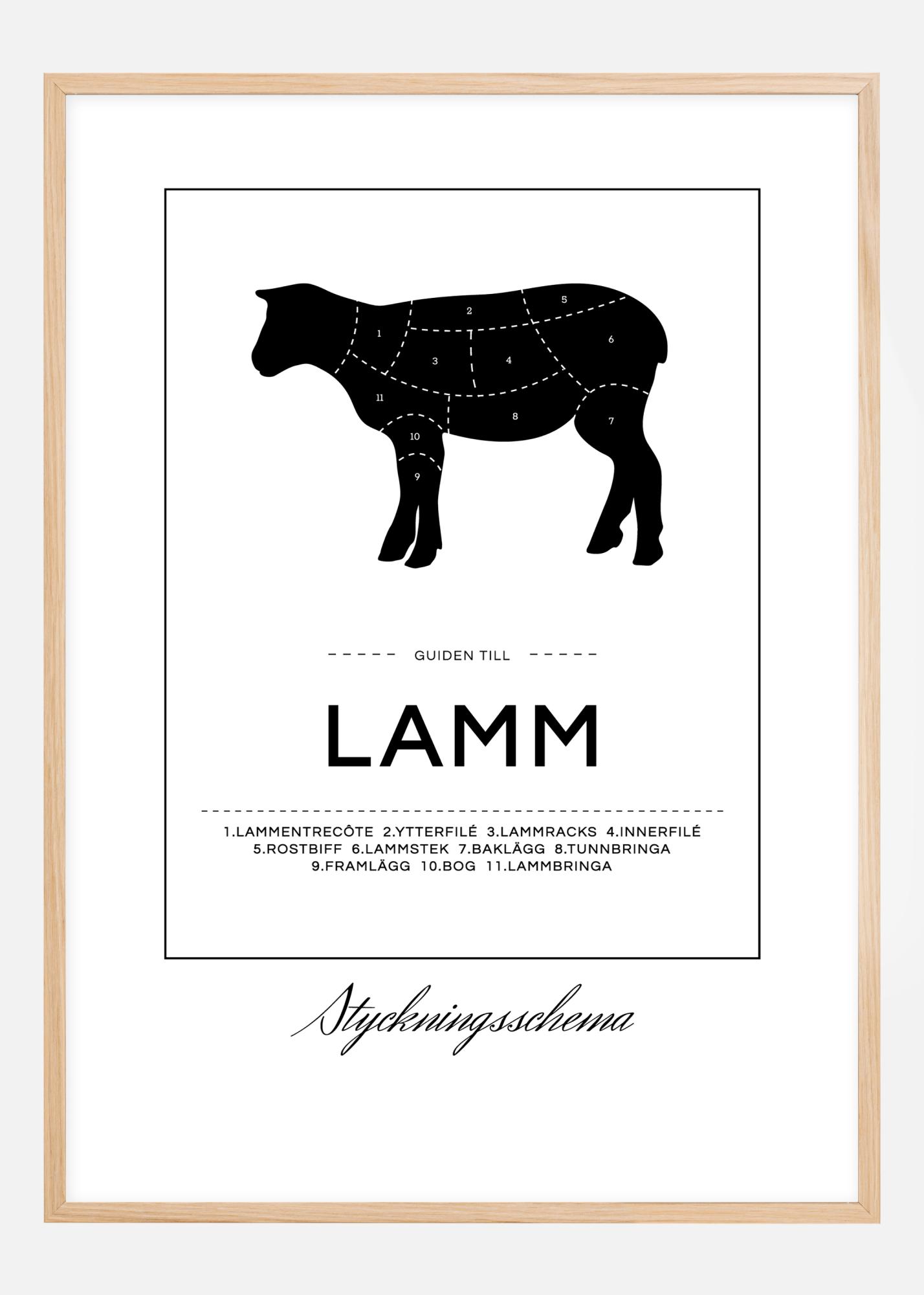 Zistite, kde nájdete všetky lahôdky z jahňacieho mäsa s týmto elegantným plagátom na stene. Plagát zobrazuje čierne jahňa rozdelené do označení, ktoré ukazujú, odkiaľ sa napríklad odoberajú sviečková, kotletky a plece. Ako doplnok k obrázku je text "Sprievodca jahňacím" spolu s čistým číselným zoznamom rôznych častí. Okolo textu a obrázku beží tenký obdĺžnik a pod obdĺžnikom je tlač s textom "Rozrábka".