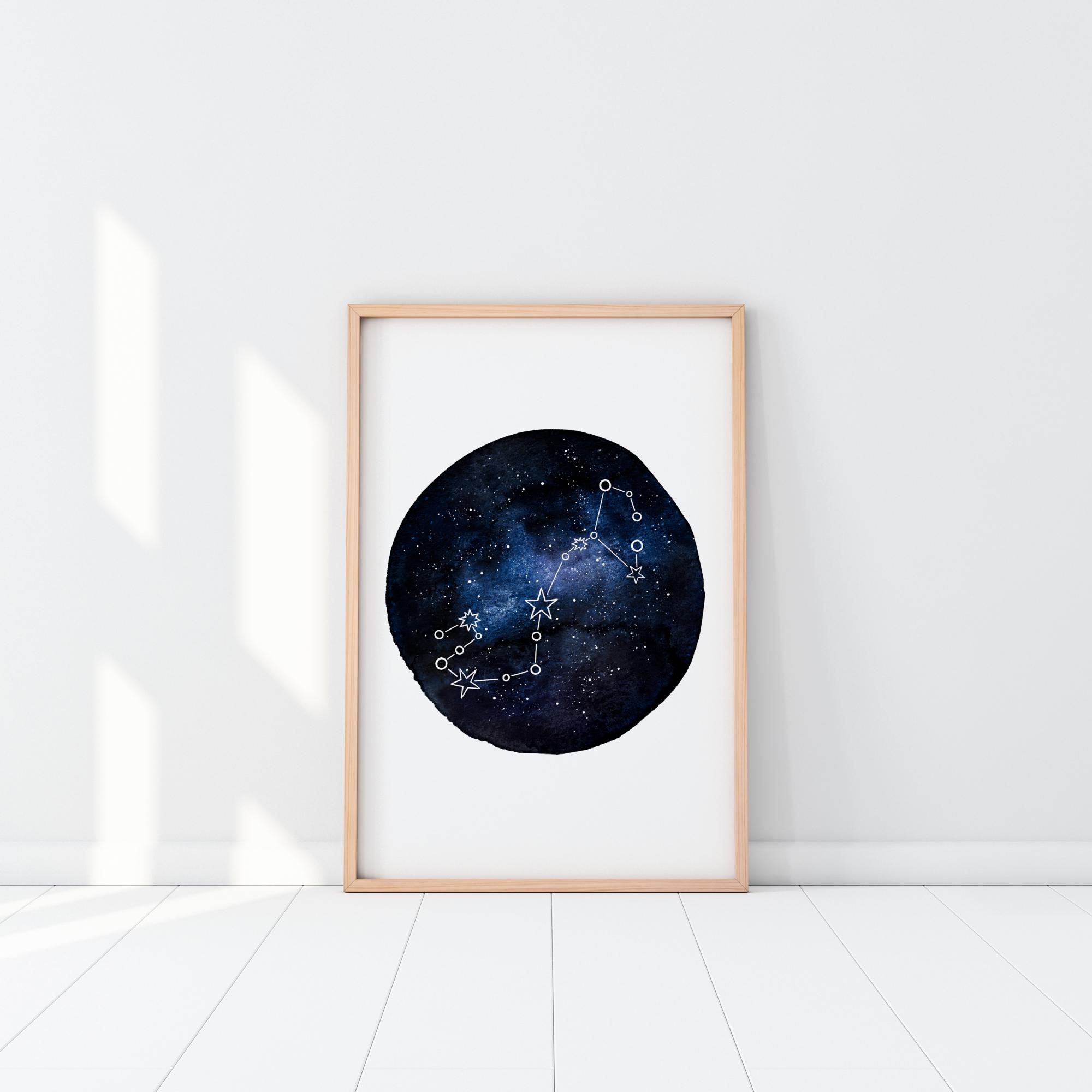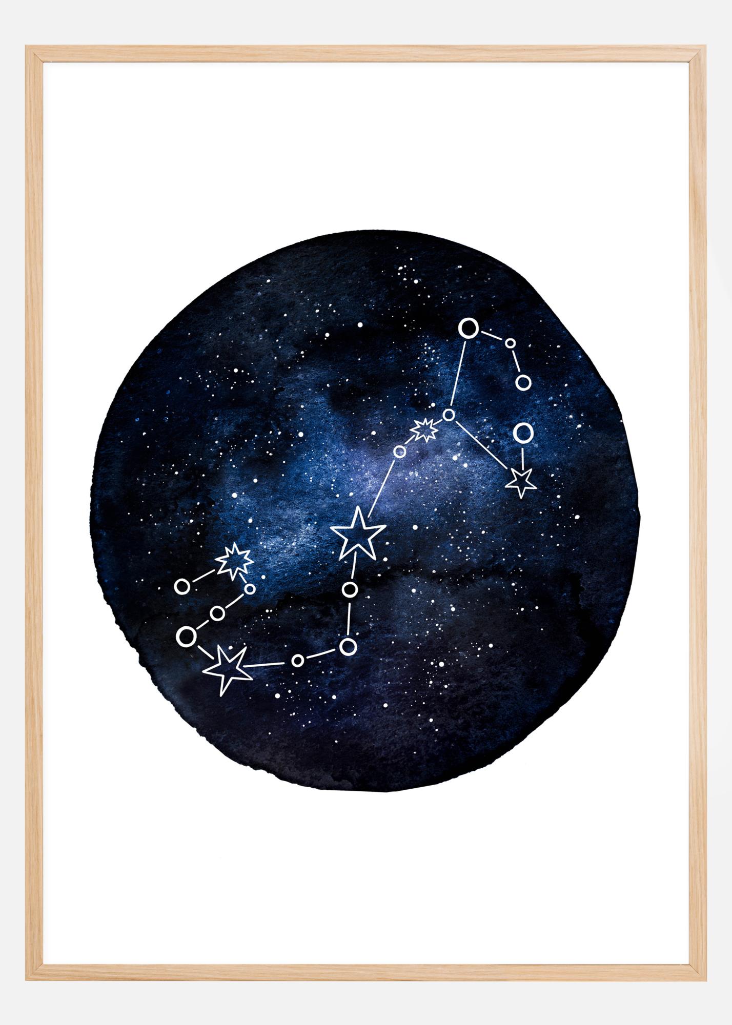 Horoskopický plagát so znamením zverokruhu Škorpión. Veľký tmavomodrý kruh sa vznáša na bielom pozadí. Vo vnútri sféry je galaxia a stovky rôznych hviezd. Nad ňou je zverokruhové znamenie pre Škorpióna. Perfektný doplnok, ak chcete ukázať svoje znamenie zverokruhu.
