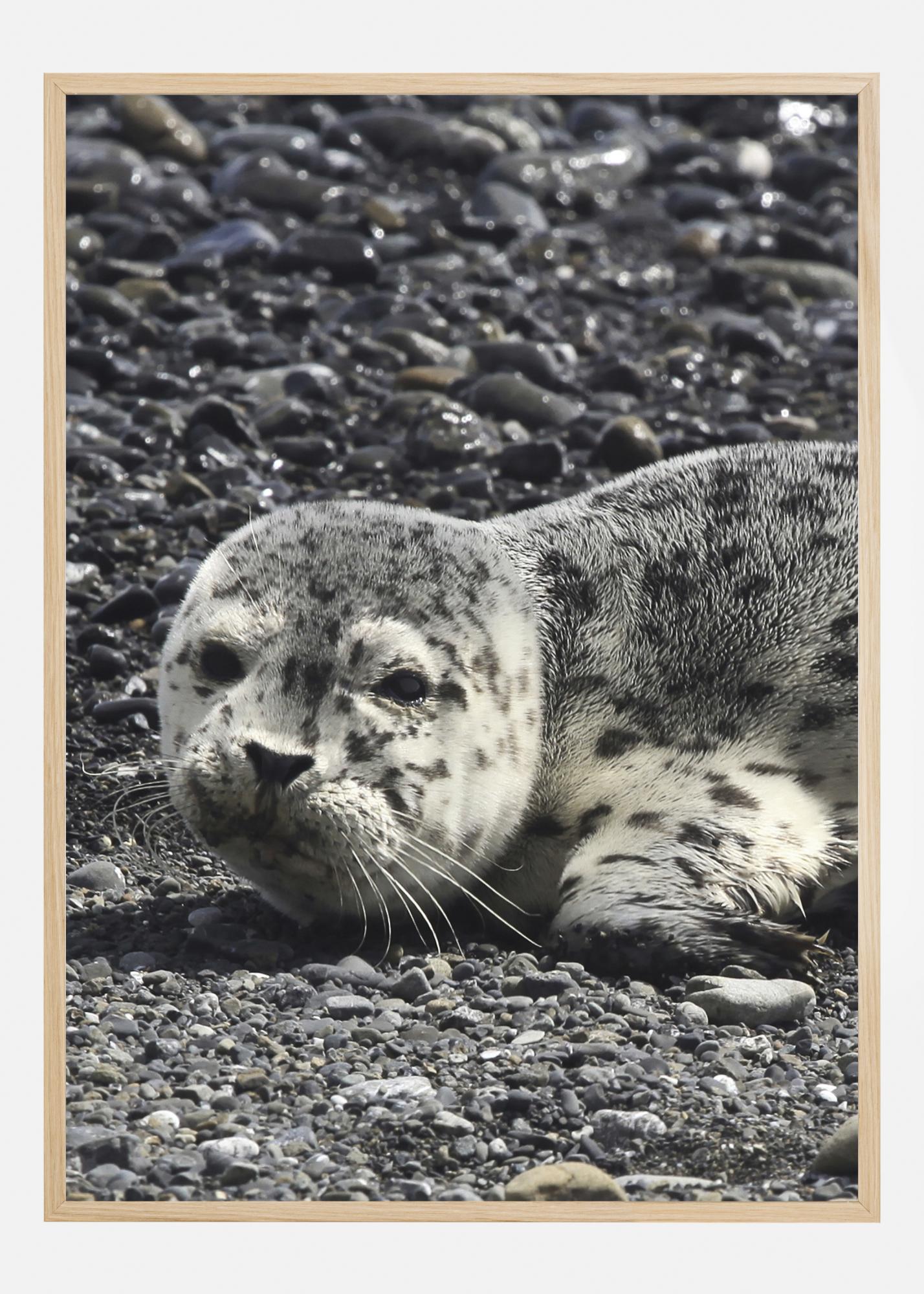 Krásny plagát so zvieratami s tuleňom na skalnatom pobreží. Sivý tuleň leží na skalách, takmer úplne zamaskovaný. Škvrny na jeho koži odrážajú kamene za ním. Pozerajte sa do duševných očí tohto morského cicavca, keď si prinesiete tento obraz domov.
