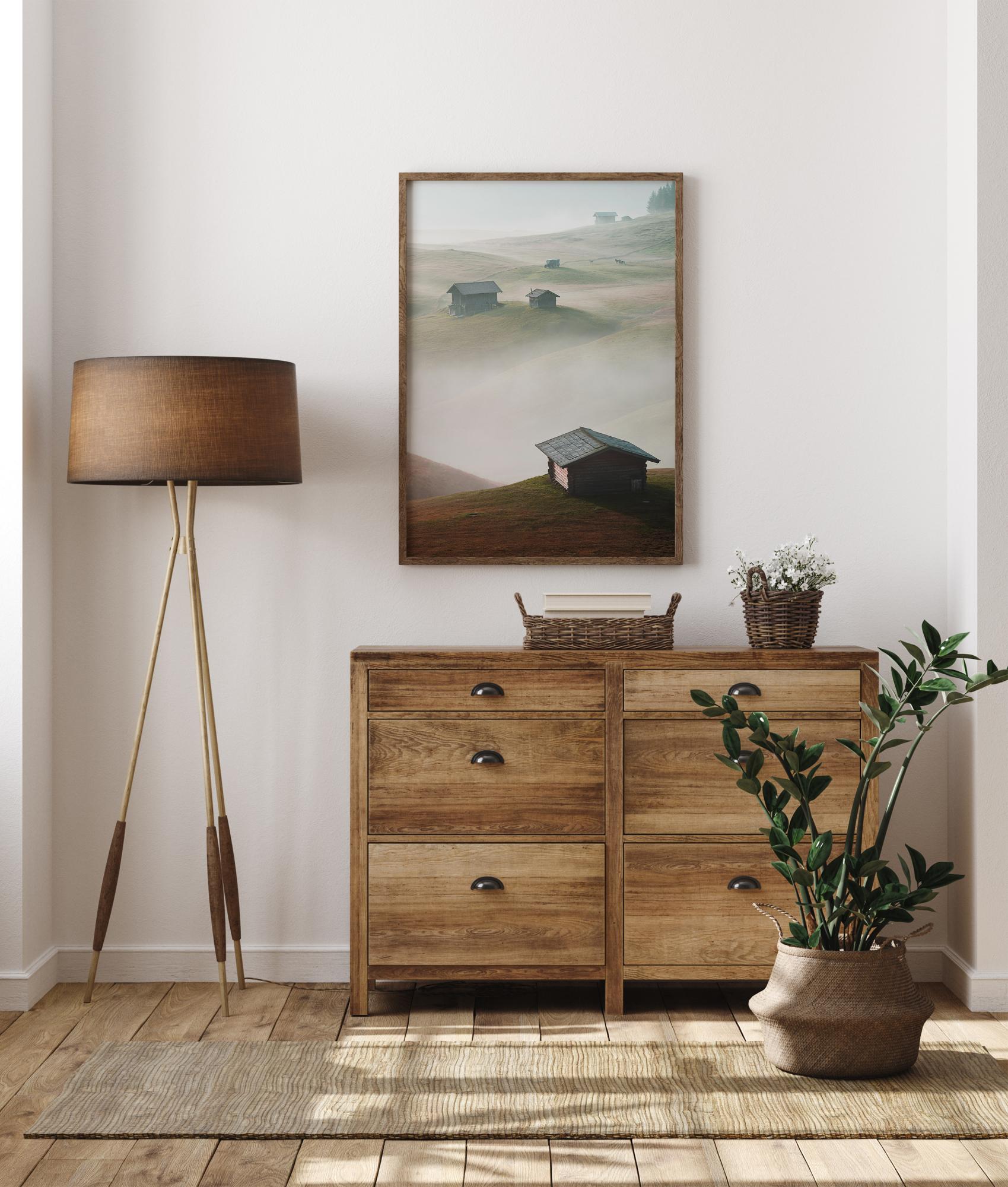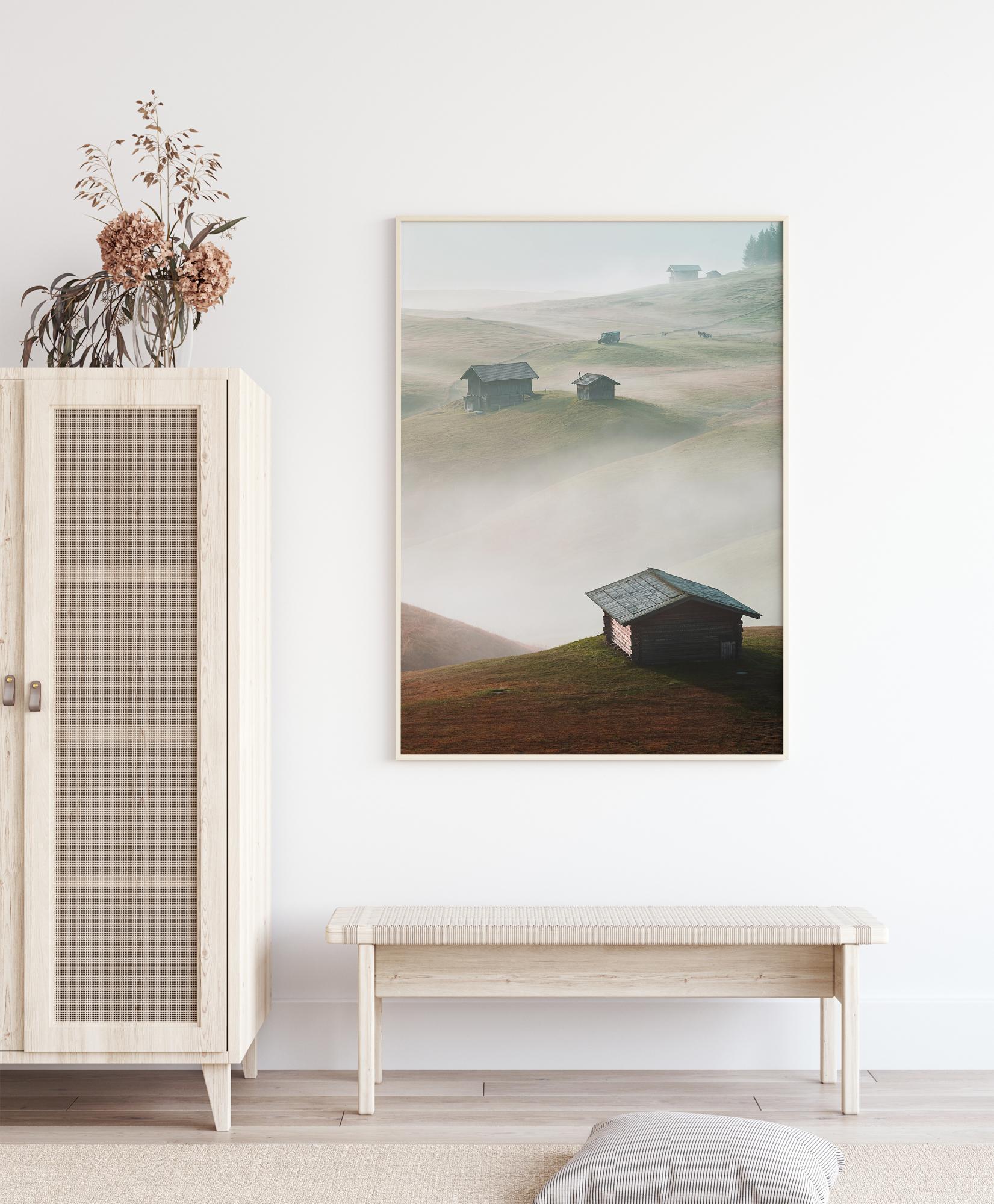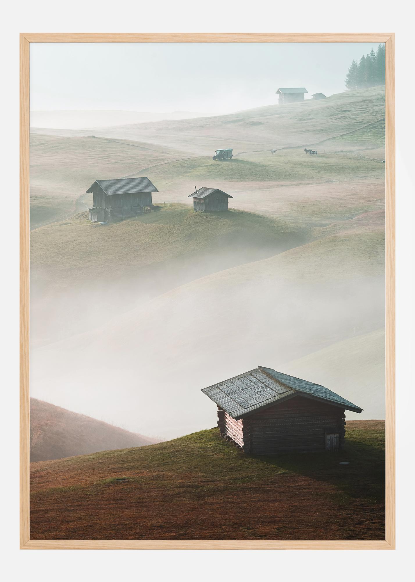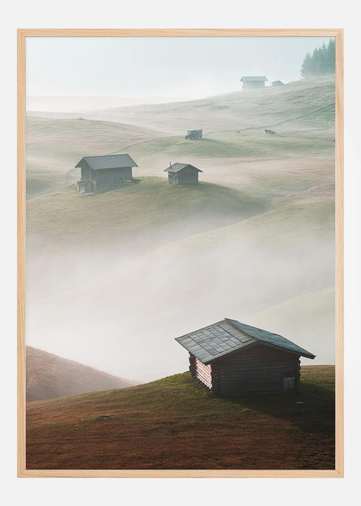 Magický plagát s domami stojacimi na kopcoch, ktoré sa týčia nad hmlou a oblakmi nižšie. Každá malá chatka vyniká na vlnitých zelených kopcoch. Hmla medzi domami ich robí, akoby ostrovy ich oddeľovali od seba navzájom. Stratíte sa v tomto rozsiahlym výhľade.