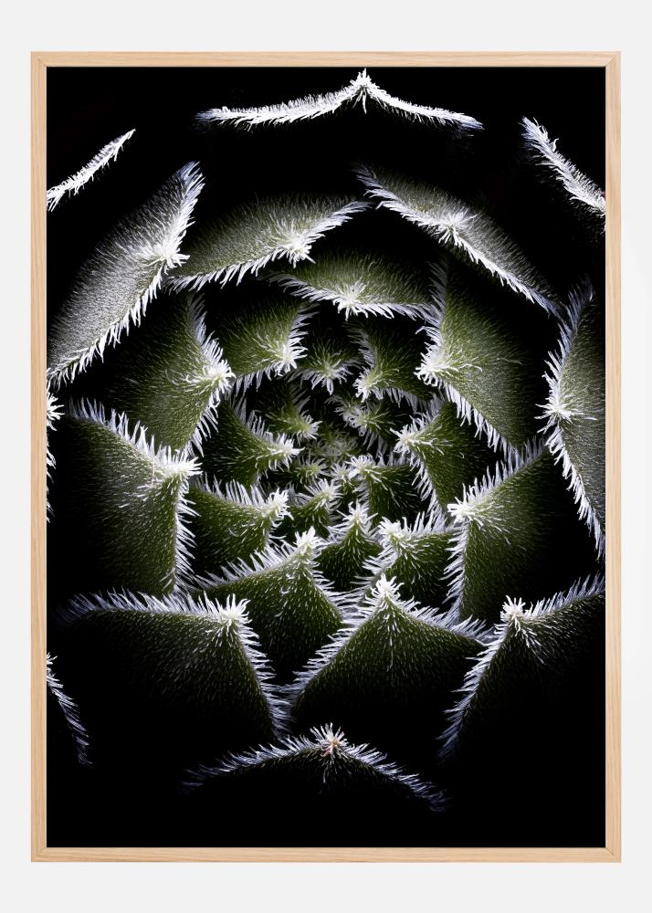 Makrofotografia rozety sempervivum. Záber zblízka tejto rastliny zobrazuje rozetu tmavozelených listov, pričom každý z nich má drobné biele tŕne. Detaily sú neuveriteľné a každý sa zastaví pri tomto úžasnom plagáte.