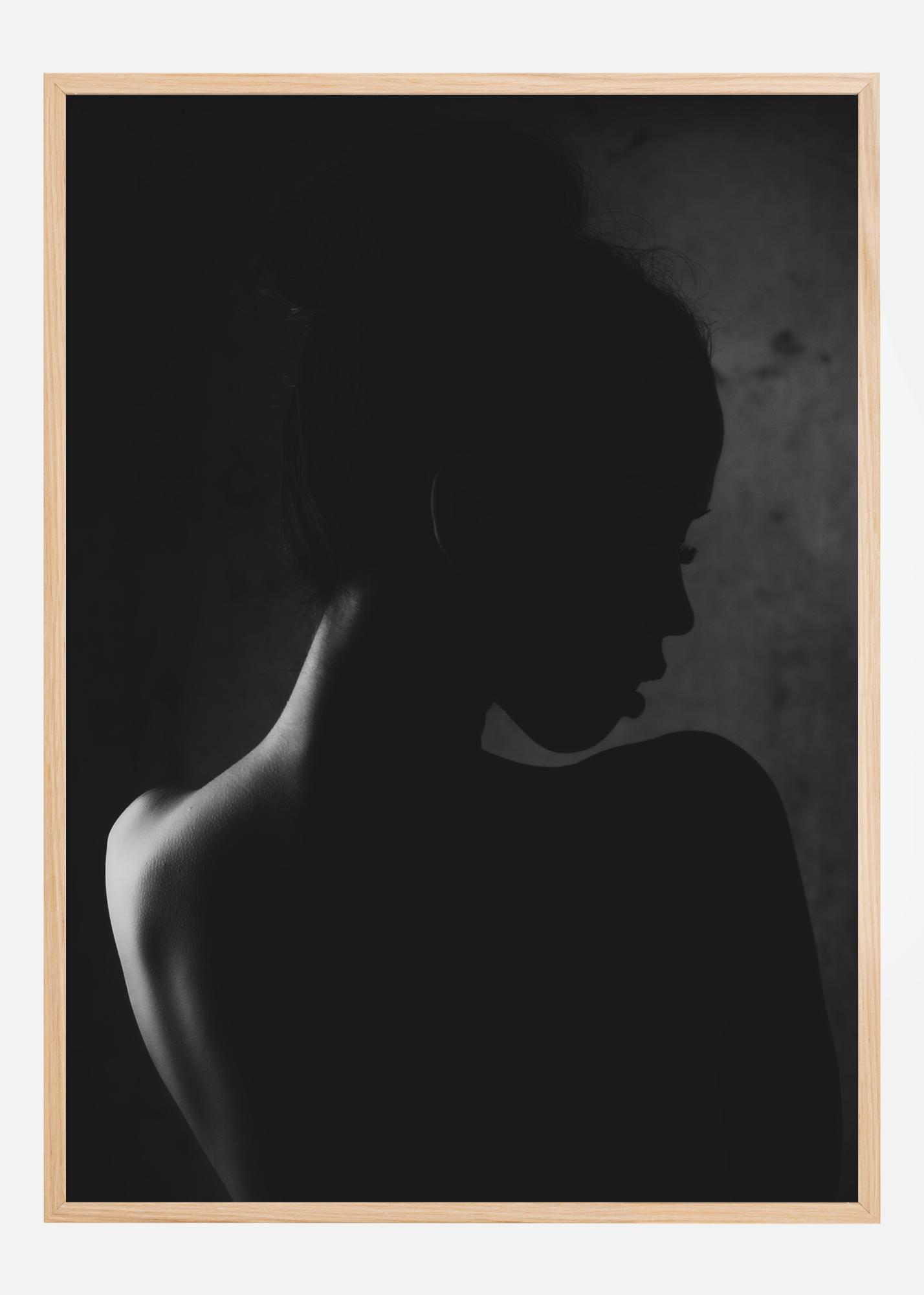 Tajomný portrétový plagát mladej ženy s chrbtom otočeným k vám. Osvetlená zľava, jej rameno je zvýraznené bielym leskom, zvyšok jej tela je zahalený v tieni. Pery sú jemne oddelené a ona jemne otáča hlavu, aby sa pozrela späť na vás cez rameno v tomto zmyselnom obraze.
