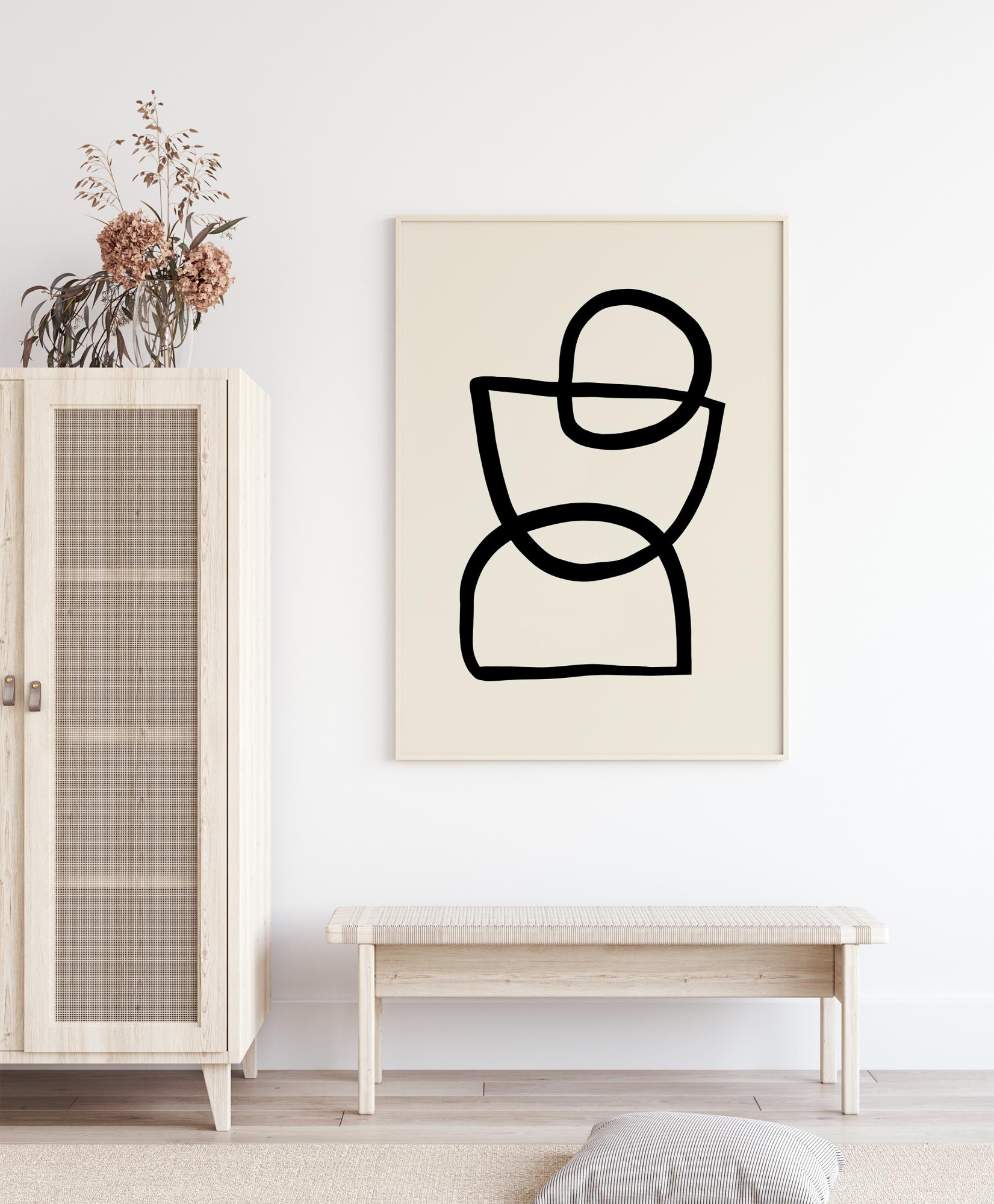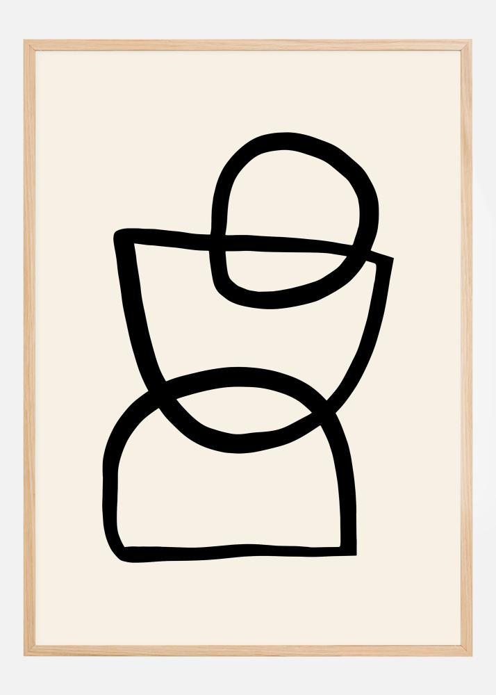 Vtipný abstraktný plagát s tromi rôznymi tvarmi, z ktorých každý je nakreslený hrubou čiernou čiarou. Na vrchu sú dva polkruhy a jeden plný kruh. Tieto sa prekrývajú, aby vytvorili abstraktný dizajn. Zaveste to doma a interpretujte obrázok presne tak, ako chcete. Je to osoba, vajíčkový pohár alebo presýpacie hodiny? Je to na vás.