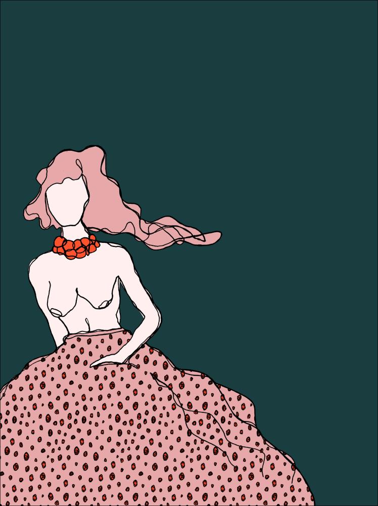 Zábavný plagát s dievčaťom na zelenej pozadí. Žena je hore bez s ružovou sukňou s veľkými škvrnami, ktorá sa vlní von. Jej ružovočervené vlasy vejú do strany v neviditeľnom vánku. Svetlooranžové perly zdobia jej krk. S jednou rukou vo vrecku, táto skica ženy v pohybe poskytuje uvoľnený pocit, ideálny pre ľahké chladné zavesenie na stenu.