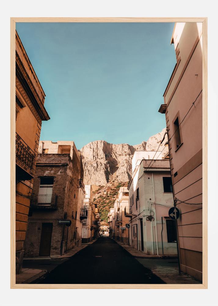 Táto očarujúca plagát zachytáva podstatu malebnej ulice v sicílskej dedinke Cinisi, s jej teplými zemnými farbami a pozadím impozantnej hory, ktorá sa týči proti jasne modrej oblohe. Bieloružové a žlté tóny budov krásne kontrastujú s drsnou horskou krajinou v pozadí a poskytujú pocit pokoja a ticha. Tento obrázok je poctou rustikálnemu šarmu Sicílie a jej schopnosti spojiť prírodu a kultúru do harmonického celku.