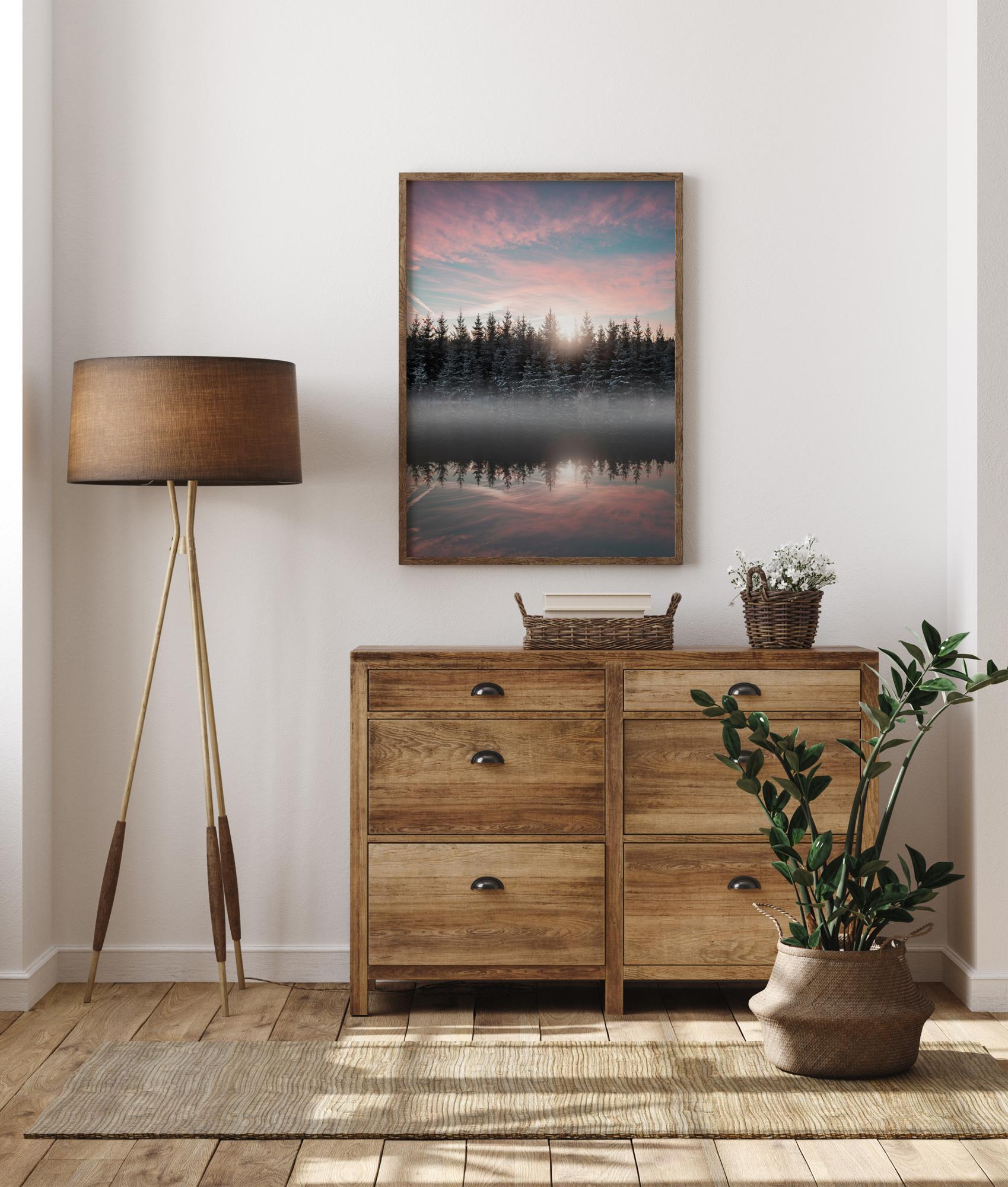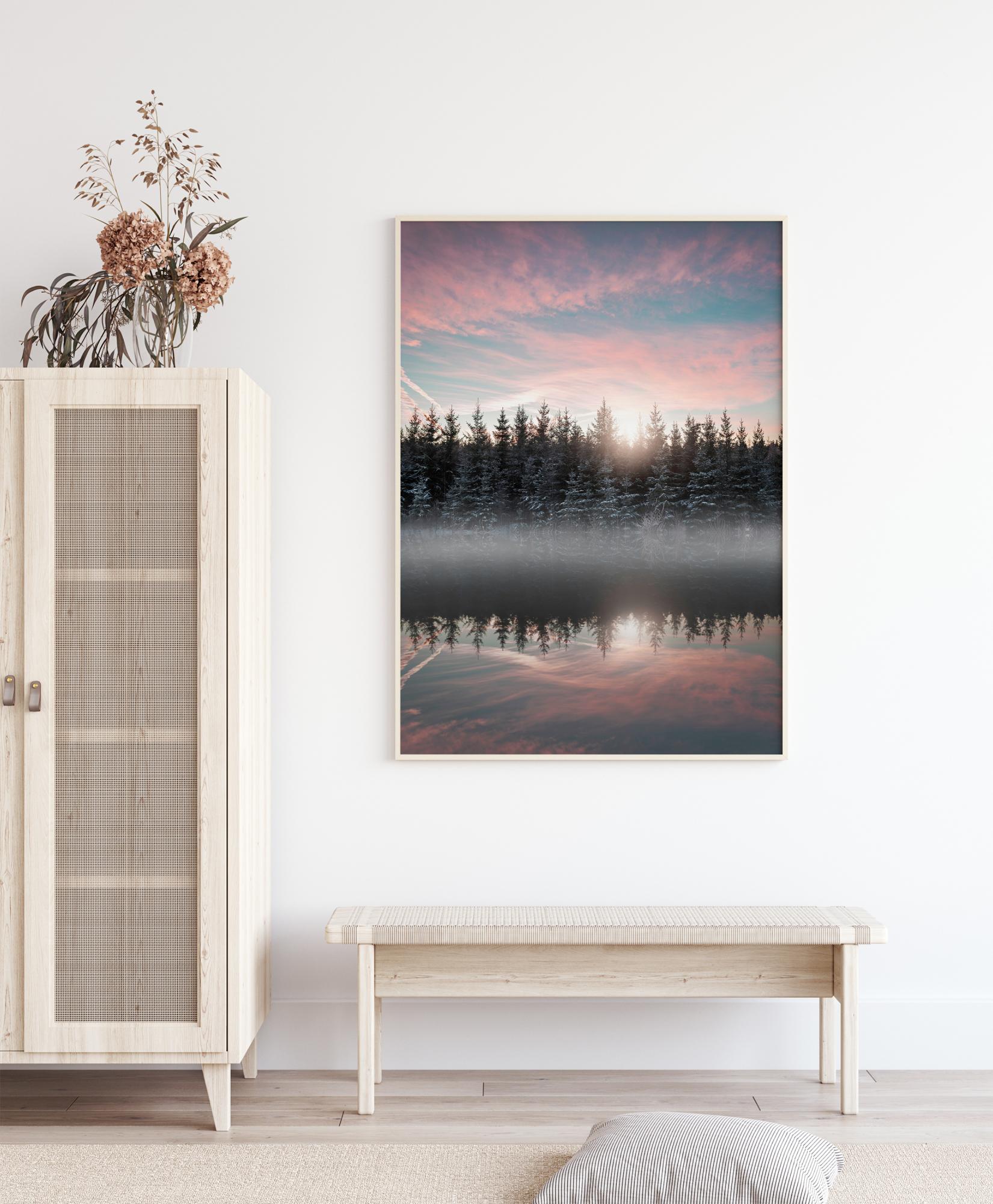 Kúzelný plagát s jazerom zahaleným v hmle v skorom rannom svetle. Stromy pokryté snehom stoja na brehu, čiastočne zahalené hmlou. Stromy sa odrážajú vo vode jazera v jemných pastelových farbách. Nad vrcholcami stromov vychádza slnko a vrhá jemné svetlo na ružovú a modrú oblohu pre pokojnú atmosféru.