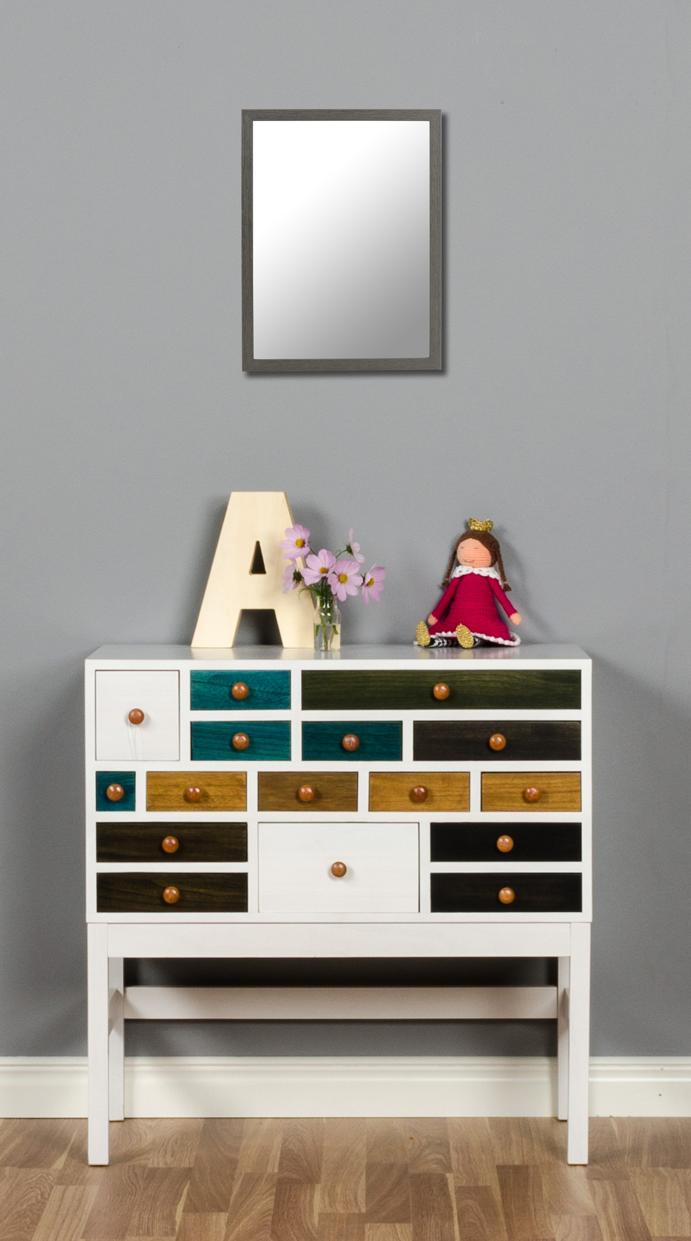 Správne zrkadlo povýši vašu stenu a zároveň sa stane pekným prvkom v interiéri. Toto štýlové zrkadlo má šedý odtieň, ktorý dokonale ladí s tapetami, textíliami a ďalšími dekoračnými prvkami v čiernej, bielej a iných šedých odtieňoch. Keďže farba je polopriehľadná, prerezáva štruktúru dreveného rámu a zanecháva prirodzený dojem. Pretože je zrkadlo vyrábané podľa vašich vlastných rozmerových požiadaviek, dostanete ho v formáte, ktorý vám a vášmu domovu najlepšie vyhovuje!