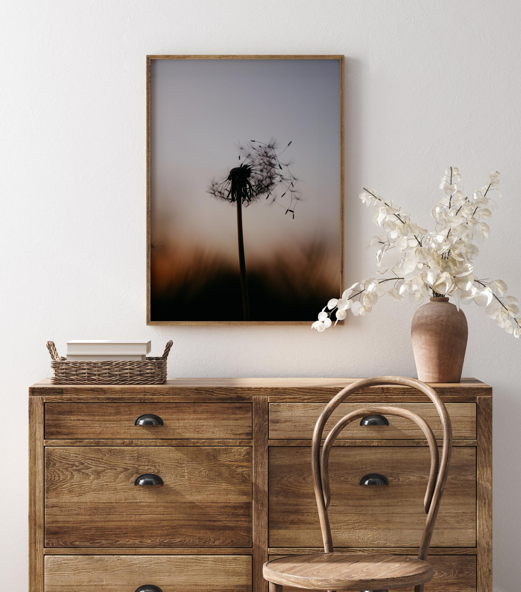 Elegantný plagát s púpavou, z ktorej polovica semien odletela. Púpava stojí v siluete v strede obrázka. Modrá obloha umožňuje jednotlivým semienkam vyniknúť vo fantastických detailoch. Mäkká oranžová tráva pod ním vytvára pocit tepla, keď cez ňu fúkne vánok.