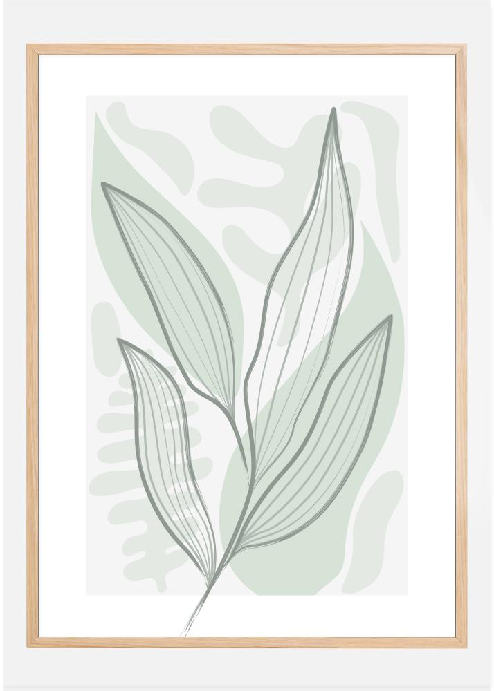 Abstraktný plagát s listami na jednoduchej zelenej pozadí s rôznymi tvarmi a vzormi listov. S jemnými zelenými a sivými farbami poskytuje jednoduchý dizajn listov, ktorý je ohraničený silnou sivou čiarou, silný, ale jemný jarný pocit, ktorý možno zavesiť v ktorejkoľvek miestnosti domu.