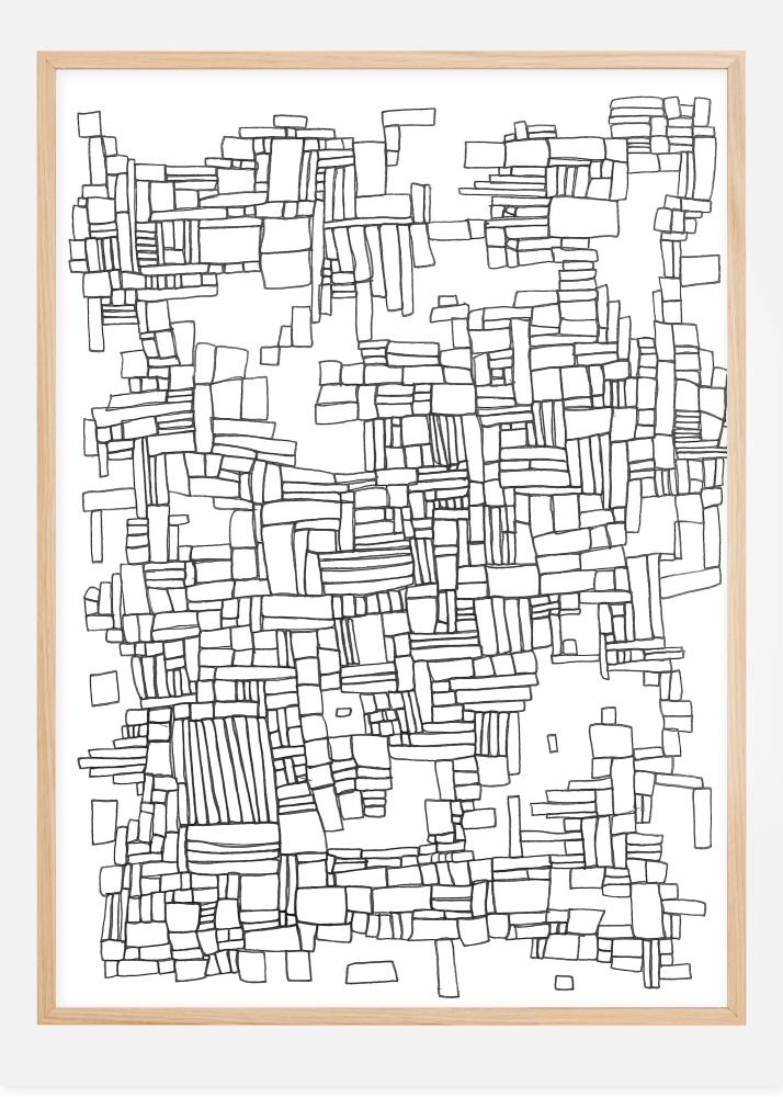 Plagát so vzorom obsahujúci geometrické štvorce v čiernych líniach na bielom pozadí. Stovky malých štvorcov a obdĺžnikov sa spájajú, aby vytvorili zvláštny vzor po celej ploche obrazu. Pozrite si ho a skúste nájsť vzory a tvary, keď máte toto hovoriace dielo zavesené doma.