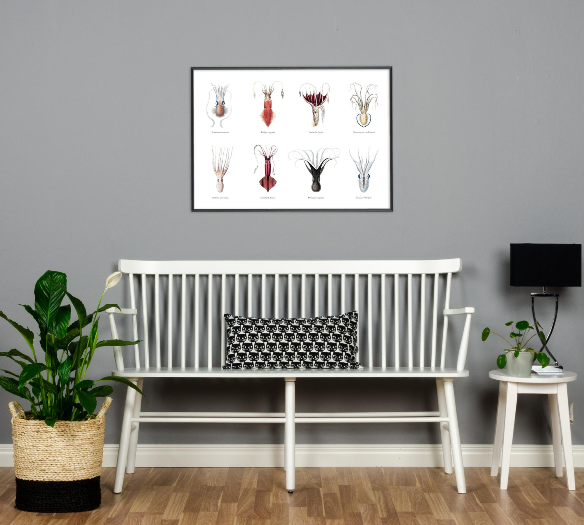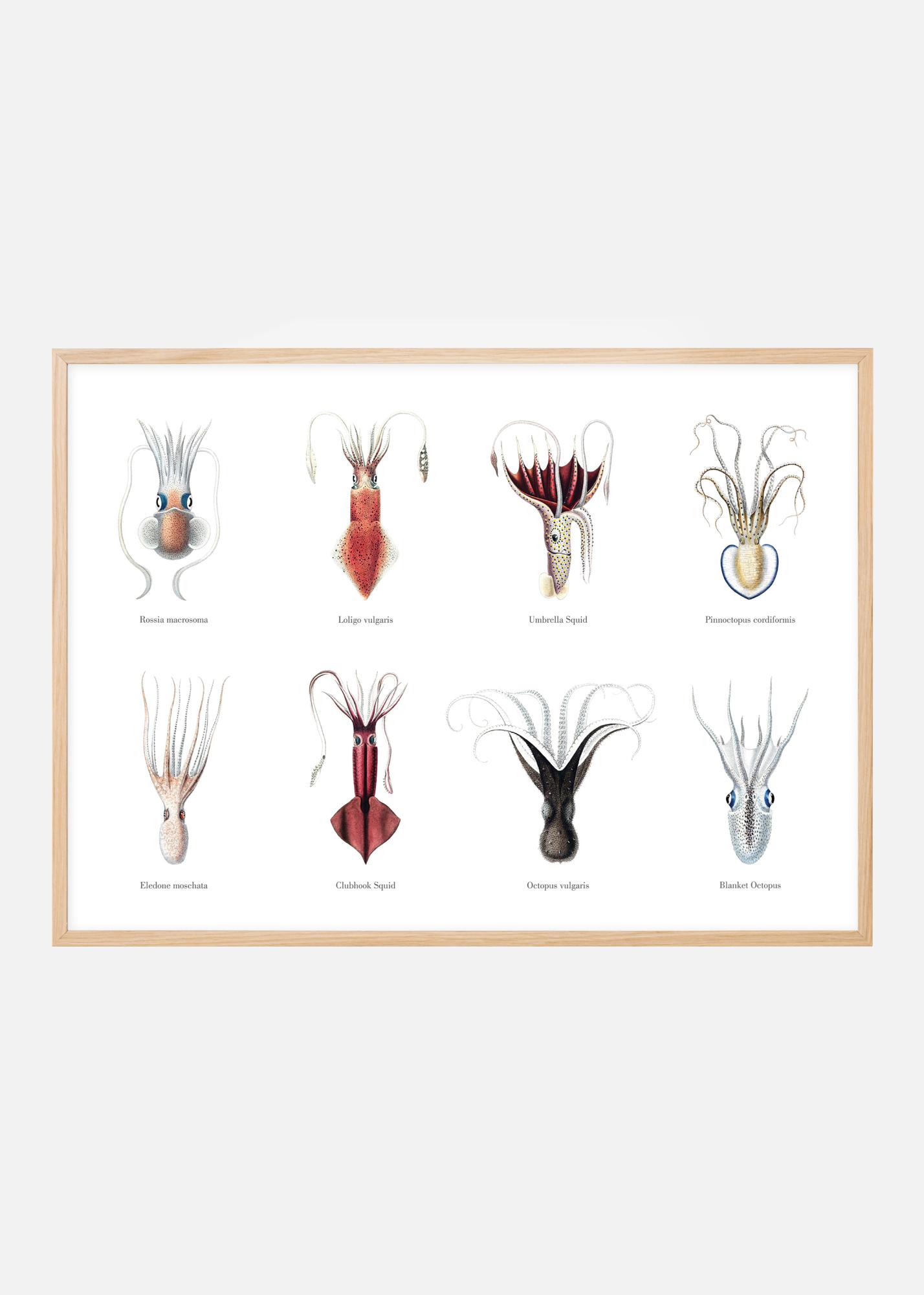 Chobotnica je naozaj zaujímavý tvor. Vedeli ste napríklad, že má 3 srdcia? Alebo že jej inteligentný mozog je maličký, napriek tomu, že obrovská vec, ktorá vyzerá ako hlava, sa zdá obsahovať obrovský mozog? Ďalej existuje takmer 800 druhov chobotníc! Tento pekný vintage poster zobrazuje 8 z nich - žiadna nie je ako druhá, ale všetky sú rovnako fascinujúce. Staré kresby majú milé, dobre spracované detaily a pod každým druhom je uvedený názov.