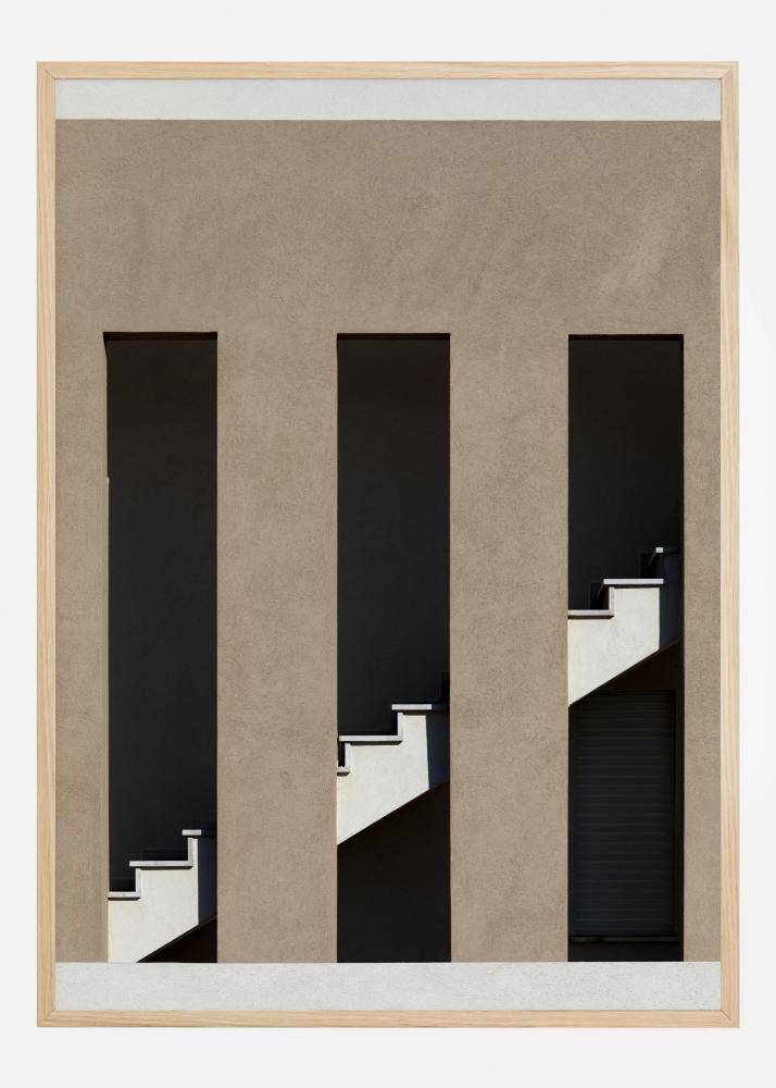 Plagát v mestskom prostredí so schodmi, ktoré stúpajú za veľkými okennými otvormi. Úžasný abstraktný obraz, kde geometrické tvary vytvárajú pocit poriadku v tomto dramatickom obraze. Tento obraz dodá vášmu domovu nádych umenia.