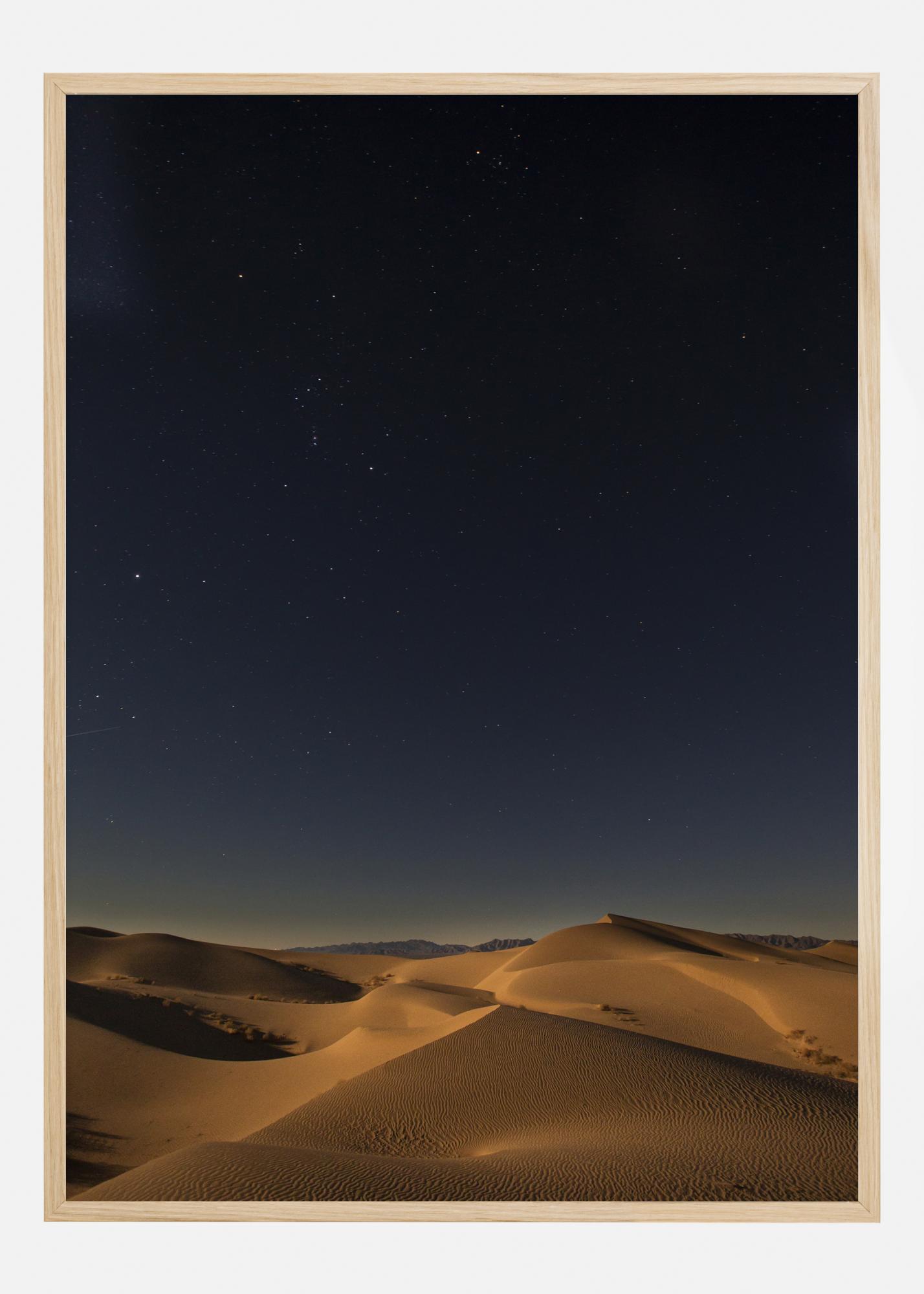 Sugestívny plagát s púšťou v noci. Mäkké zlatisté piesočné duny sa rozprestierajú do diaľky v dolnej časti obrázka. Nad pieskom sa rozprestiera obrovská tmavomodrá obloha s mäkkými hviezdami roztrúsenými po nej. Vytvorte pocit priestoru, keď tento plagát zavesíte doma.