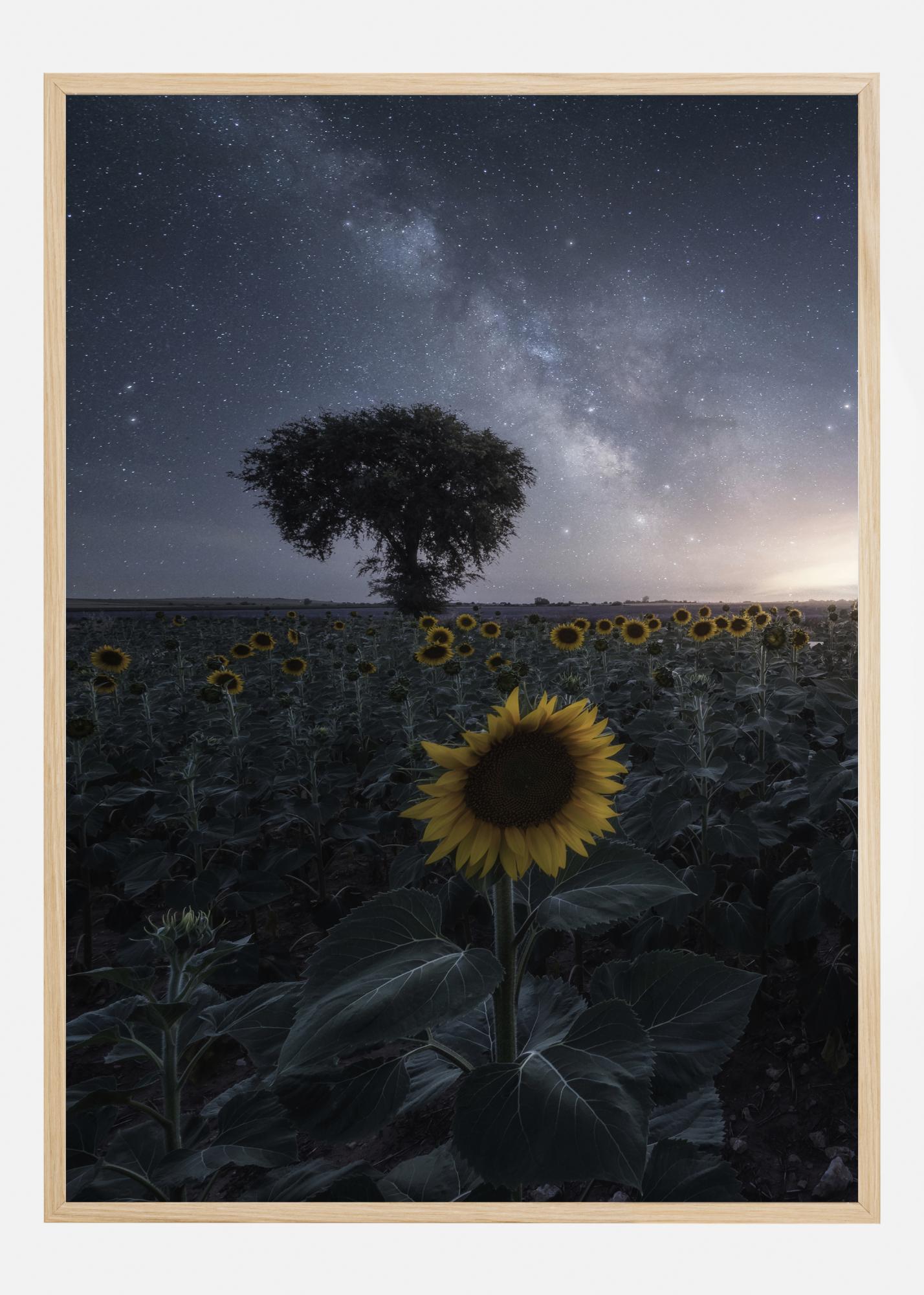 Kvetinový plagát so slnečnicami v noci. Pole slnečníc drží svetložlté kvety proti nočnej oblohe. To sa odráža v západe slnka v diaľke, ktorý ešte stále osvieti kvety, ale aj osvieti oblohu, aby mohli byť vidieť hviezdy. Mystika je v tomto výhľade v hojnej miere.