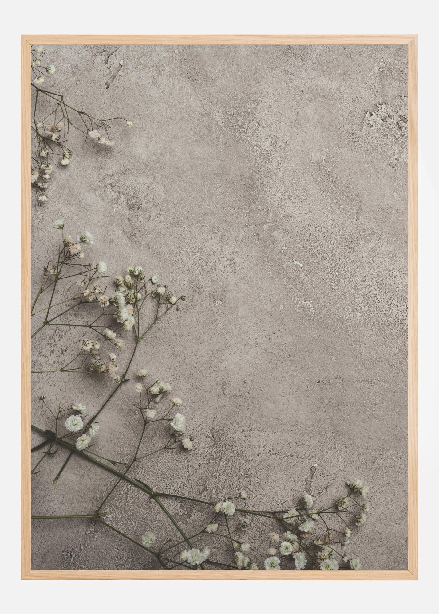 Prírodný plagát s kvitnúcimi rastlinnými stonkami rozloženými na kamennej podlahe. Jemné biele kvety a ich tmavšie rozvetvené stonky sa hodia k vzorom na štruktúrovanej svetlosivej podlahe. Tu možno vidieť zmes jemných a tvrdých prvkov, čo vytvára tento zaujímavý obraz.