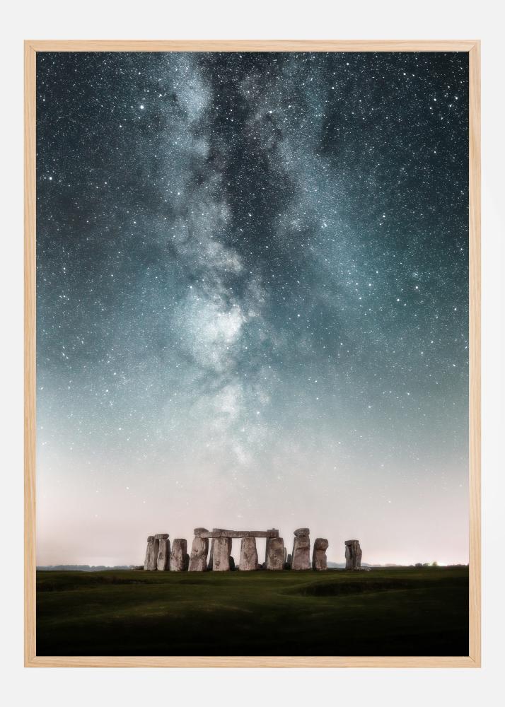 Slávny plagát s pamiatkou Stonehenge proti dramatickej nočnej oblohe plnej hviezd. Tento široký obrázok sa zameriava na dramatickú Mliečnu dráhu, ktorá prechádza modrou oblohou plnou hviezd. Sledujte galaxiu smerom nadol, kým neuvidíte Stonehenge ako malú kamennú formáciu v dolnej časti obrázku, aby ste získali iný pohľad na tento impozantný svetový zázrak.