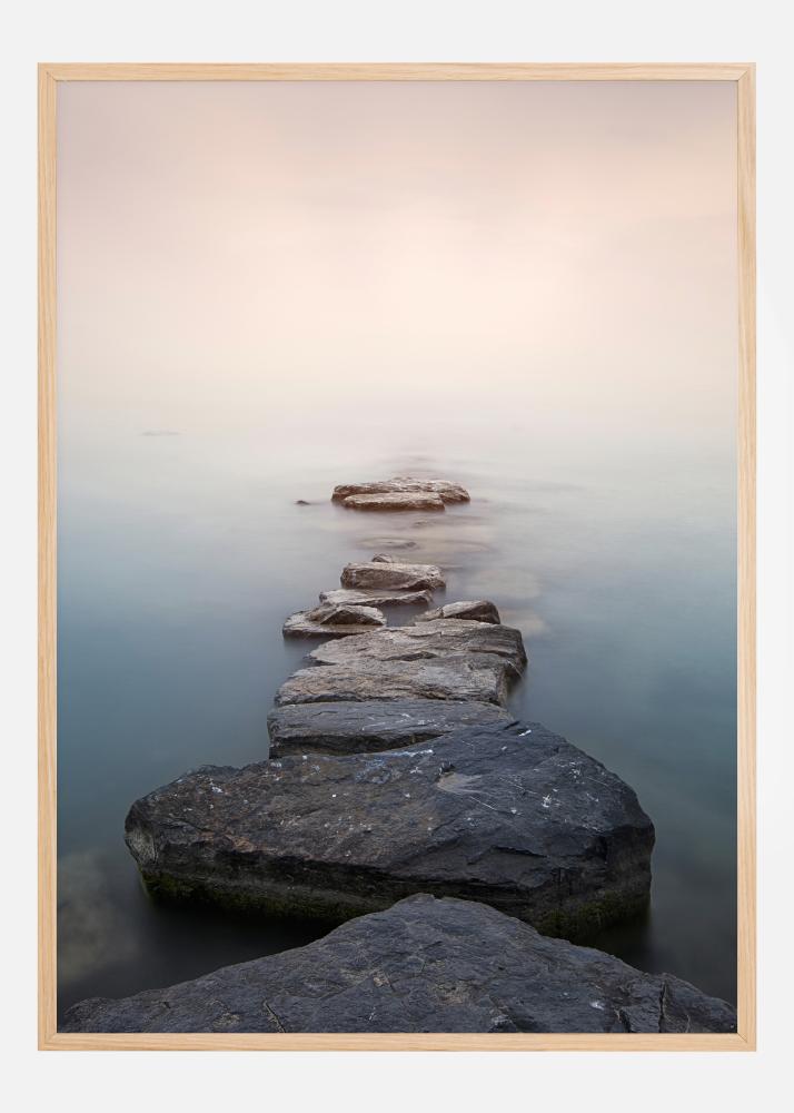 Éterický plagát s kameňmi, ktoré vedú cez jazero do neznáma. Veľké kamene vedú do hmly sveta ďalej. Jemné modré a ružové farby dodávajú tomuto obrazu jemný magický dotyk. Urobte prvý krok a uvidíte, kam vás vaše nohy zavedú.