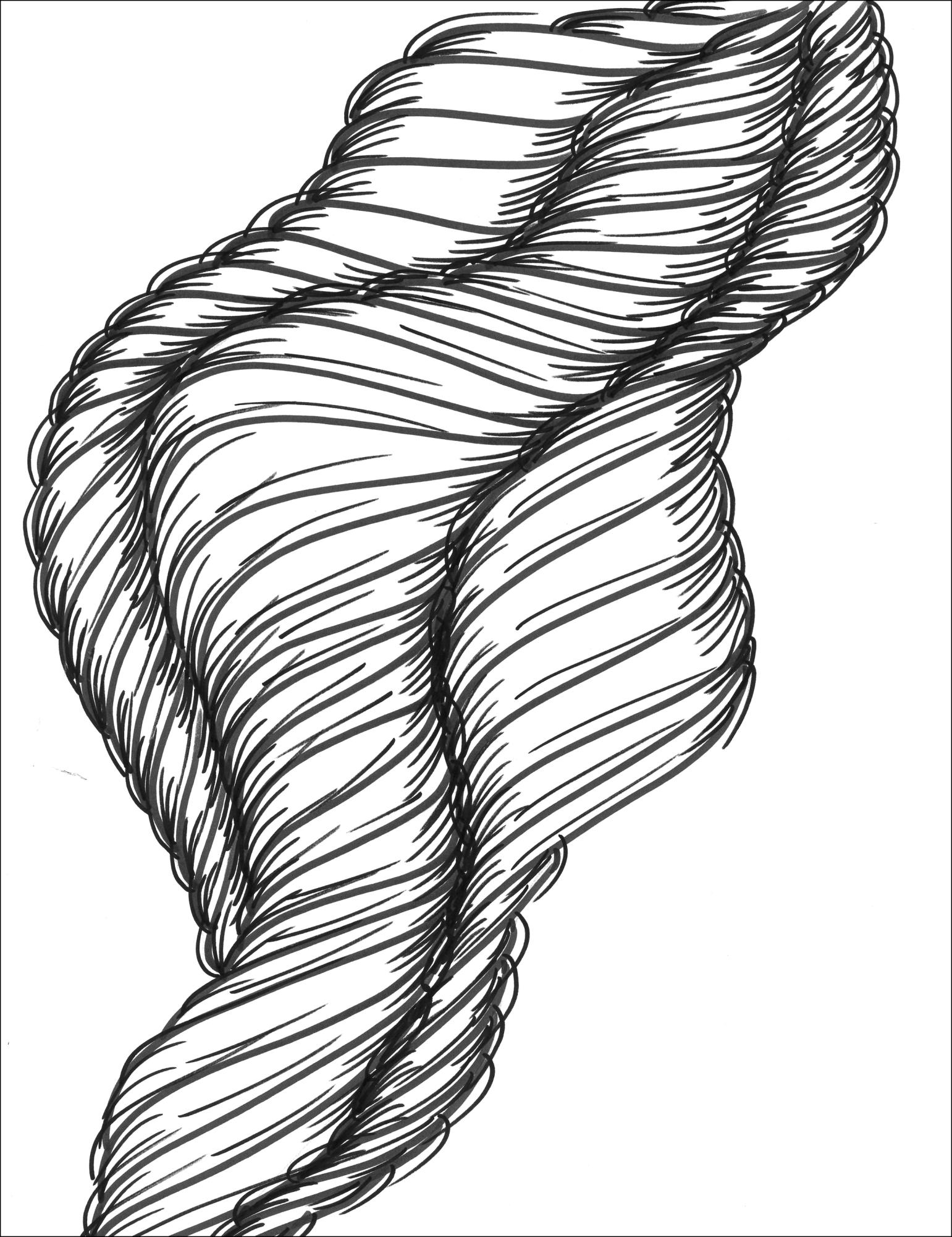 Virálna abstraktná plagát s čiernymi čiarami, ktoré sa splietajú, aby vytvorili tvar tornáda. Tri čierne špirálové čiary sa točia na bielom pozadí. Hrubé a tenké čiary vytvárajú takmer pohyblivý obraz, ktorý vedie pohľad, keď sa pohybuje po diele.