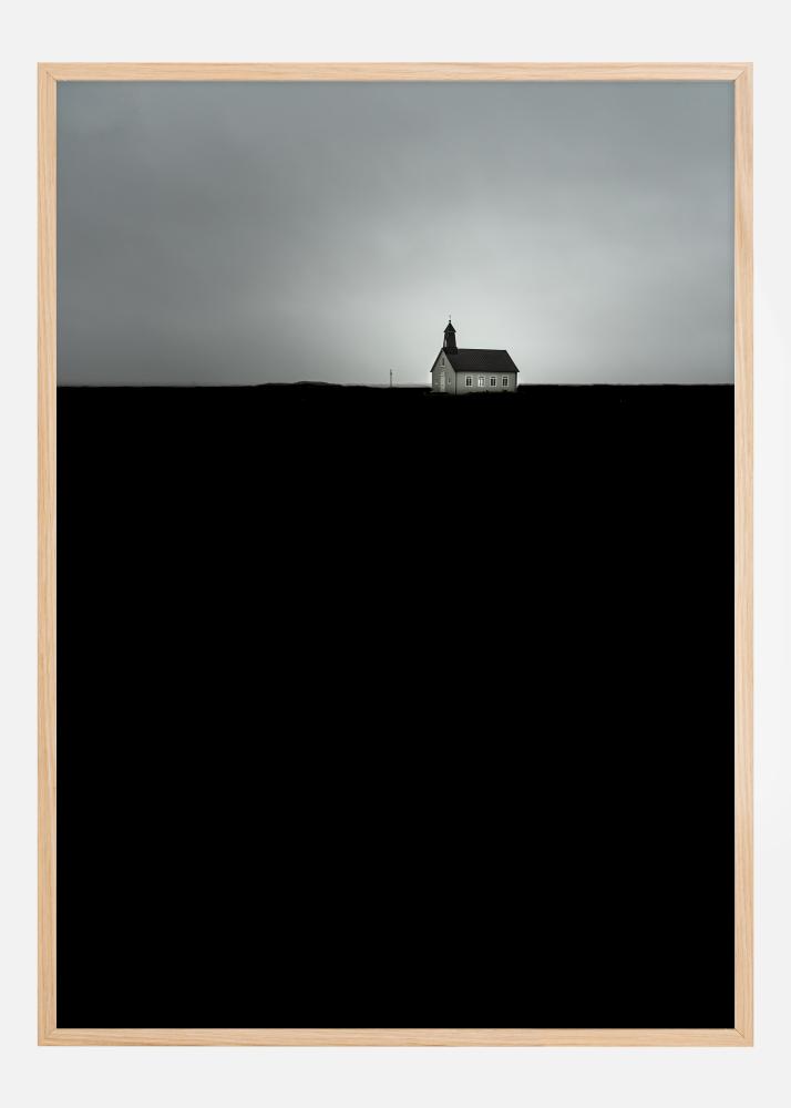 Táto fotografia poskytuje silný a náladový obraz Strandarkirkja, osamotene stojaceho kostola proti dramatickej oblohe. Tmavá silueta krajiny vytvára ostrý kontrast voči šedej oblohe, čo dáva pocit izolácie a pokoja. Biele steny kostola osvetľujú krajinu a ponúkajú symbol nádeje a vedenia v okolitej tme.