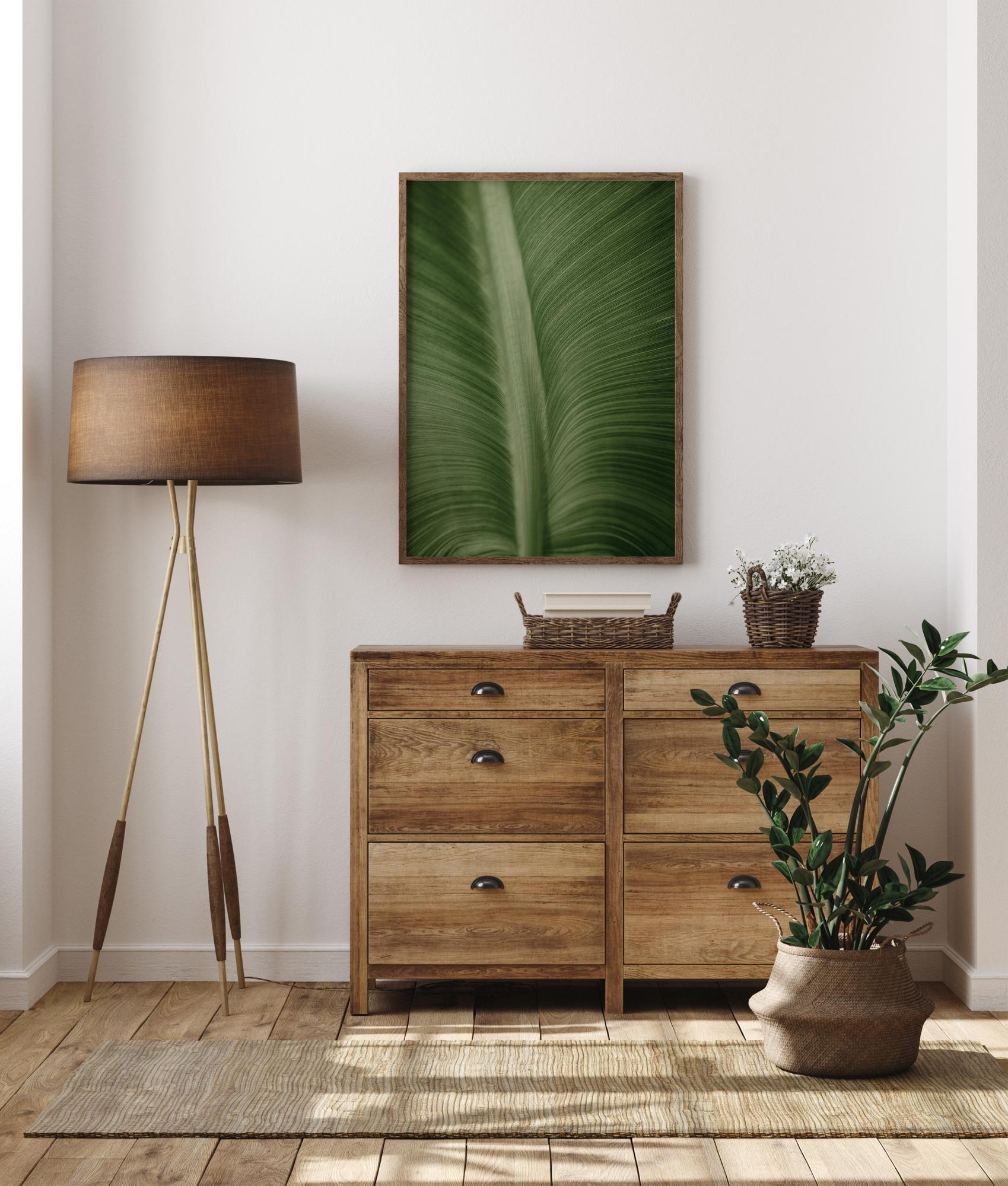 Makroposter s listom zobrazujúcim štruktúru žíl a stopky. Krásne zelené farby vyplňujú obraz, aby poskytli veľmi upokojujúci efekt. Tenké žily sa jemne ohýbajú von z hrubého a silného stredného žila listu. Ponorte sa do prírody s týmto detailným záberom.