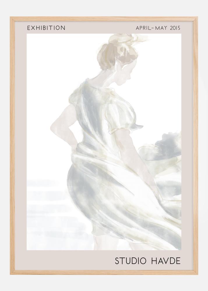 Tento elegantný a vzdušný plagát z výstavy Studio Havde v apríli-máji 2015 zachytáva esenciu ľahkosti a pohybu. Ilustrácia zobrazuje ženskú postavu, namaľovanú jemnými, akvarelovými ťahmi štetca, ktorá sa zdá pohybovať sa pôvabne po plátne. Farby sú tlmené a harmonické, s odtieňmi bledomodrej, krémovej a náznakmi zlata, ktoré spolu vytvárajú pocit nadčasovej krásy a elegancie.