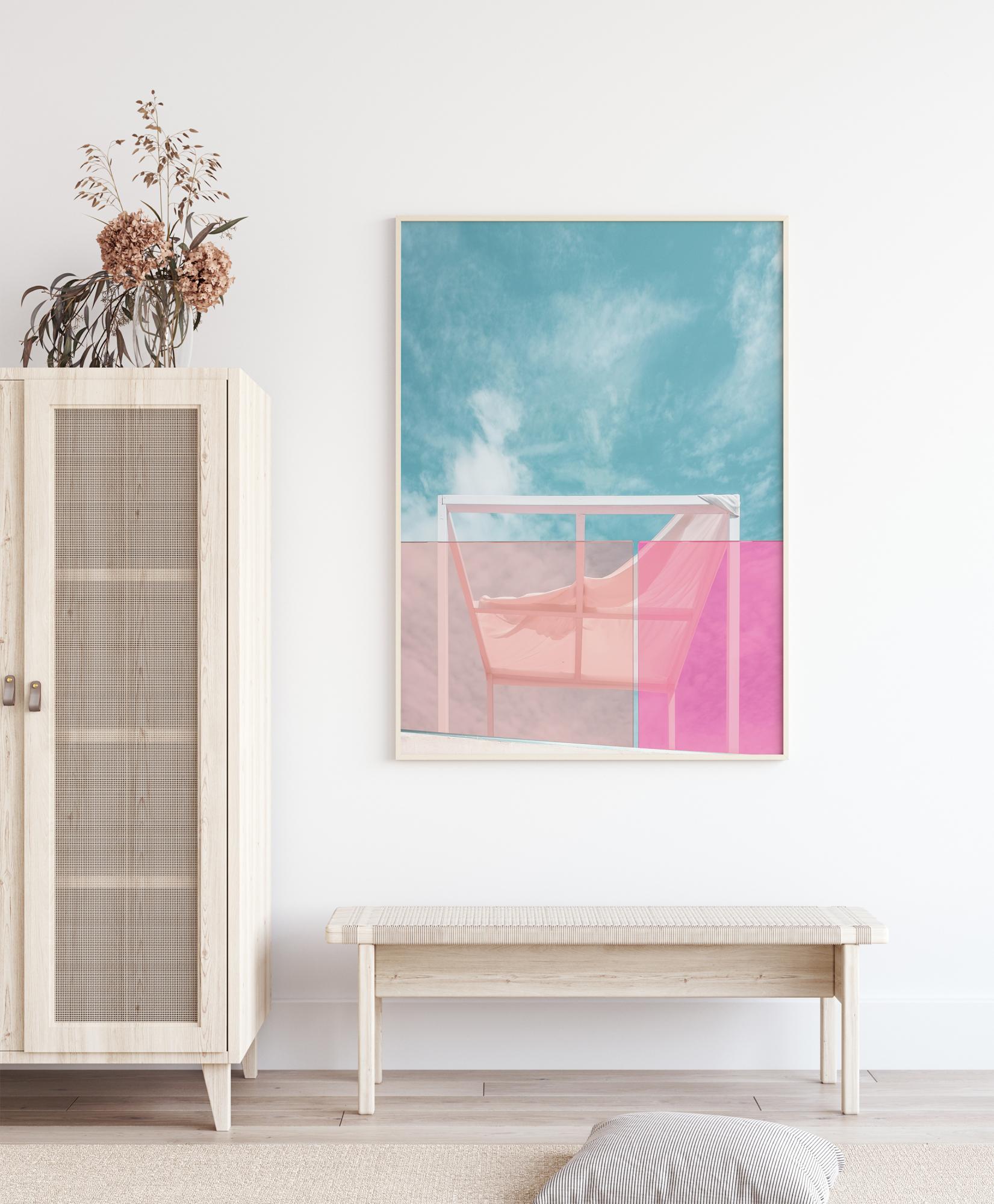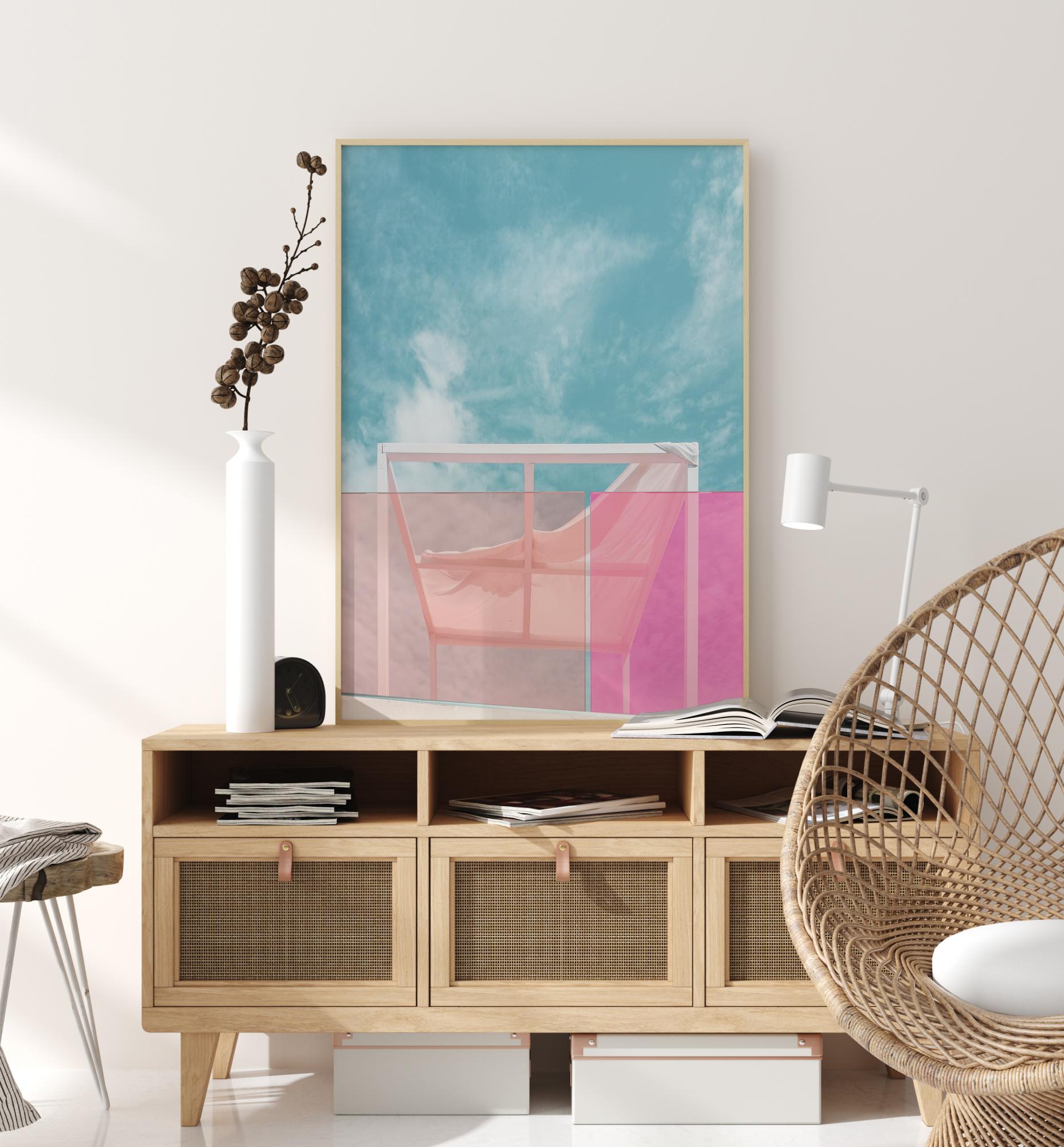 Farebný plagát s letnou oblohou a slnečnou strechou. Cez ružové sklenené tabule balkóna možno vidieť bielu strešnú plochu a mäkké biele oblaky na modrej oblohe. Predstavte si opaľovanie na tejto streche počas teplého letného dňa.
