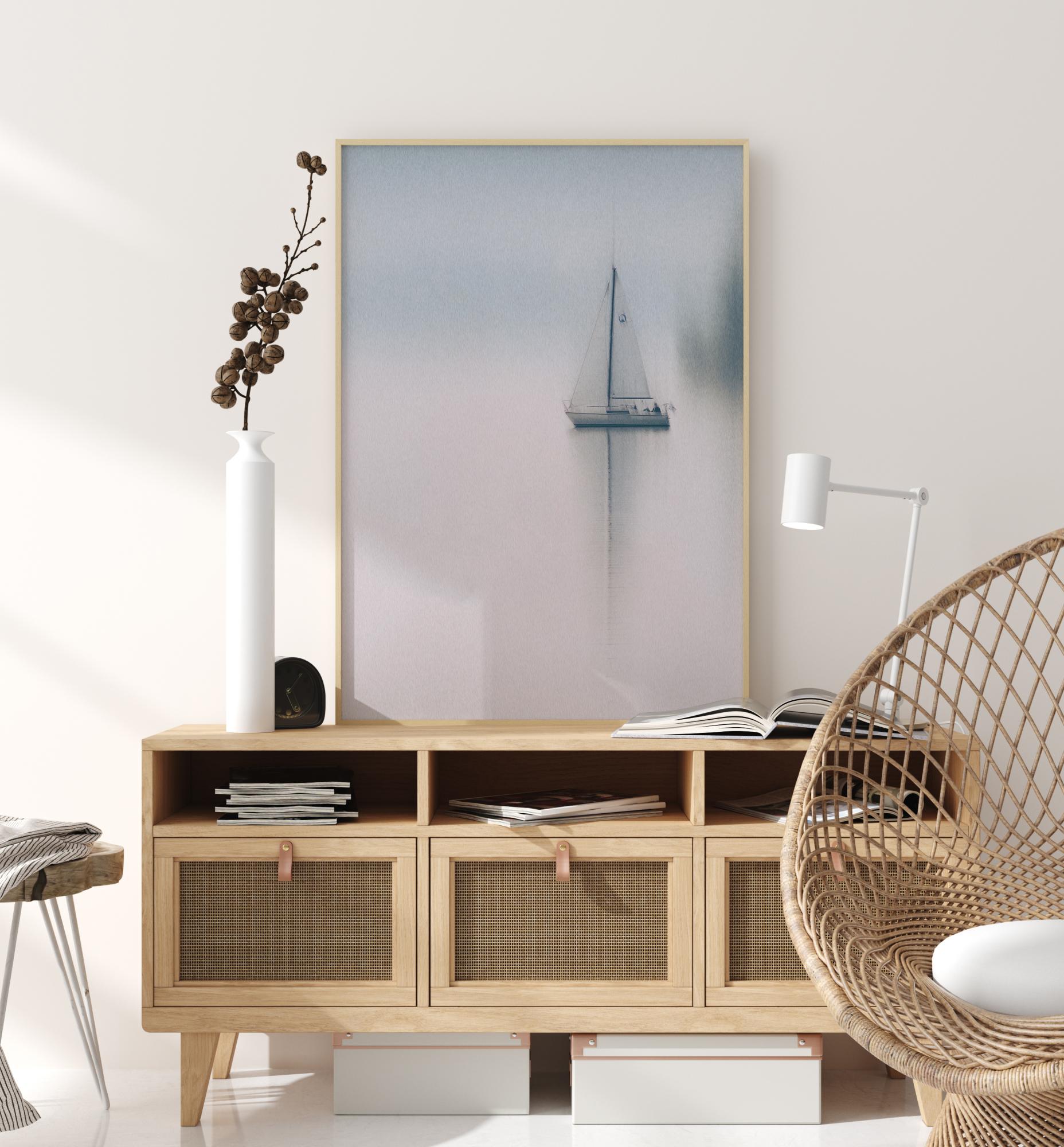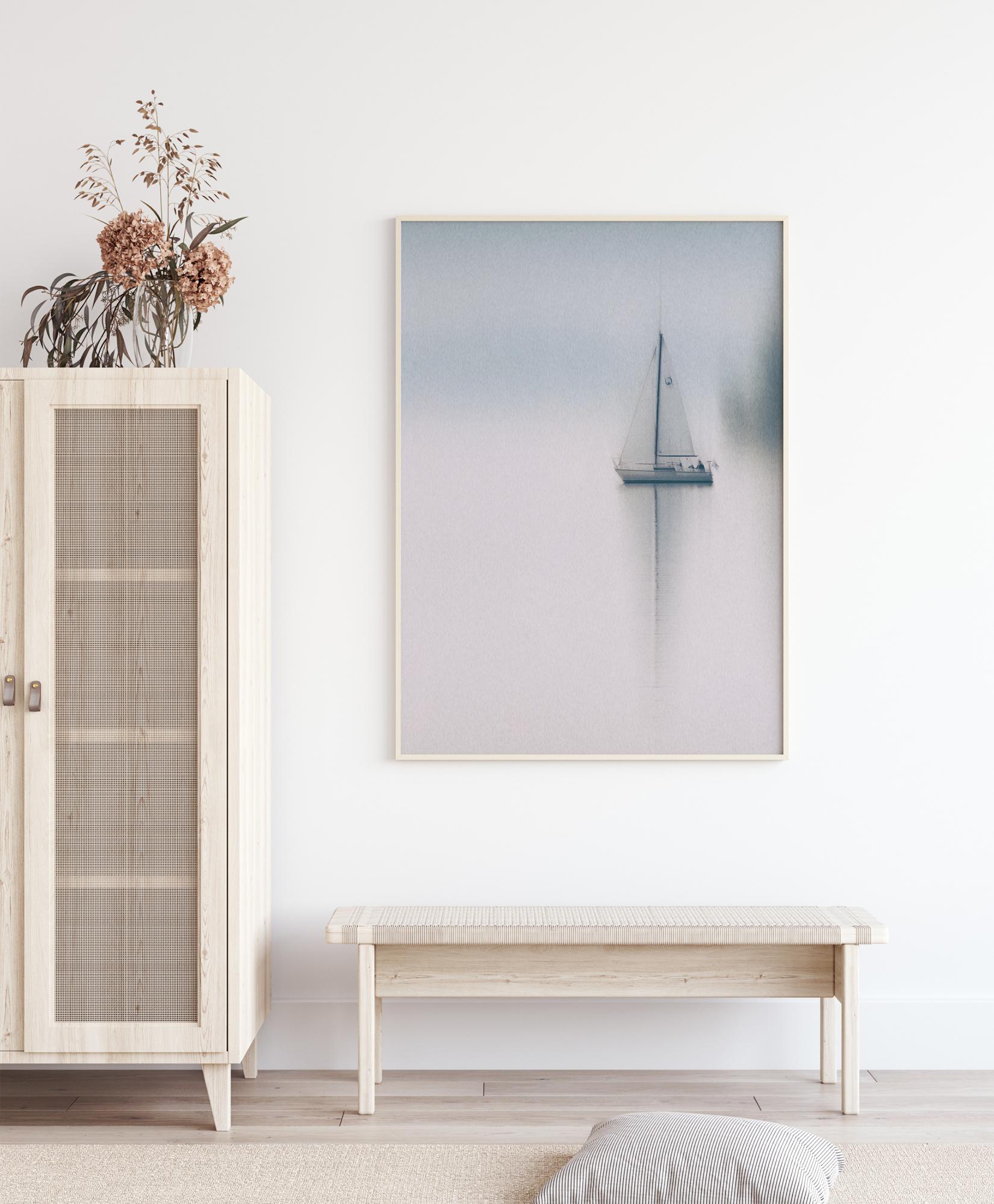 Upokojujúci plagát jachty uprostred bieleho jazera. Obraz je mäkký s rozmazanými okrajmi na všetkých figúrach. Plachta lode je natiahnutá na vode, keď sa kĺže v svetlomodrej a sivej hmle v skoré nedeľné ráno.