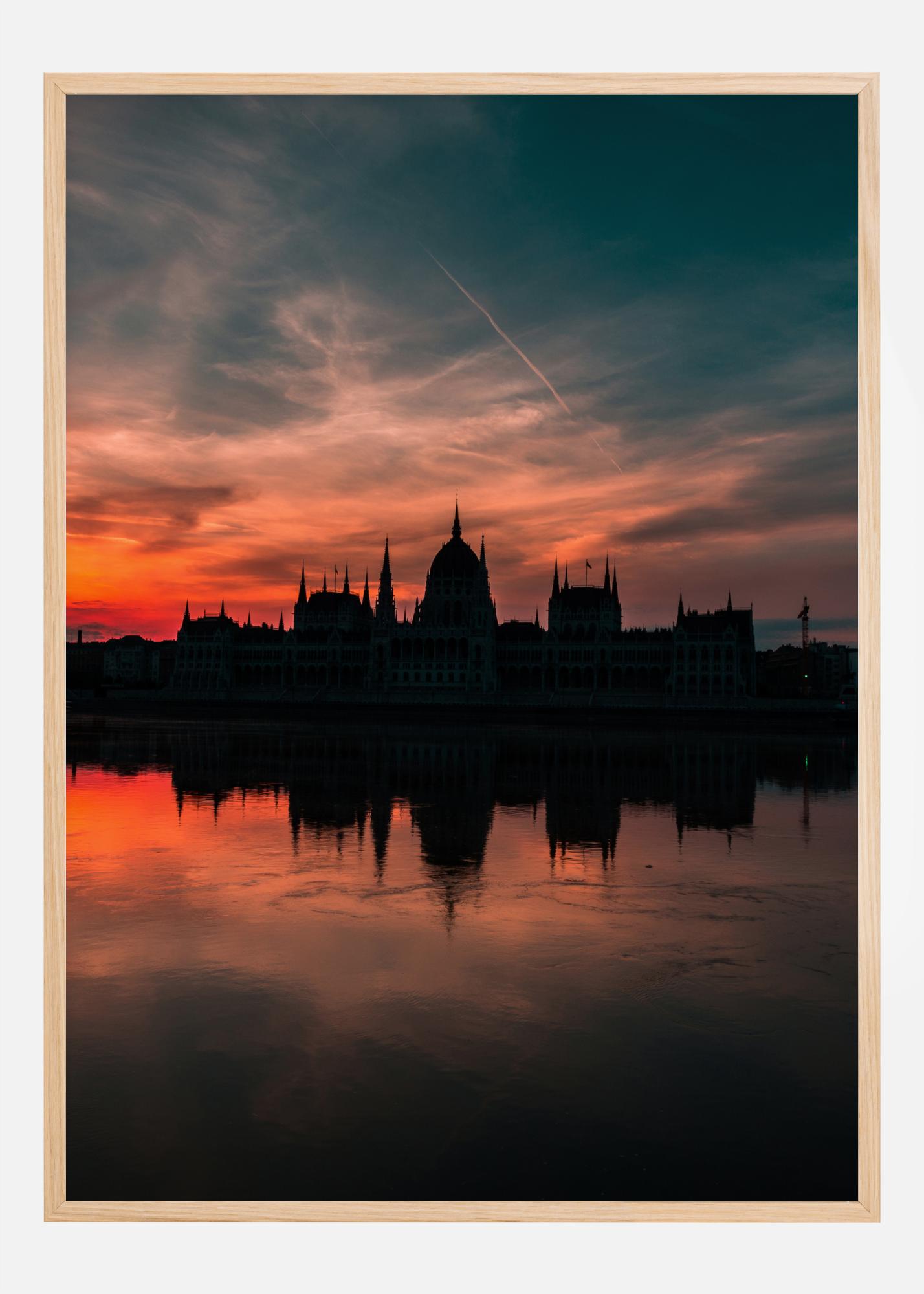 Plagát západu slnka s mestom s výhľadom na veľkú vodnú plochu. Silueta tmavých čiernych veží mesta sa odráža vo vode. V pozadí osvetľuje úžasný červený západ slnka oblohu a vrhá dramatické osvetlenie na vodu a mesto.