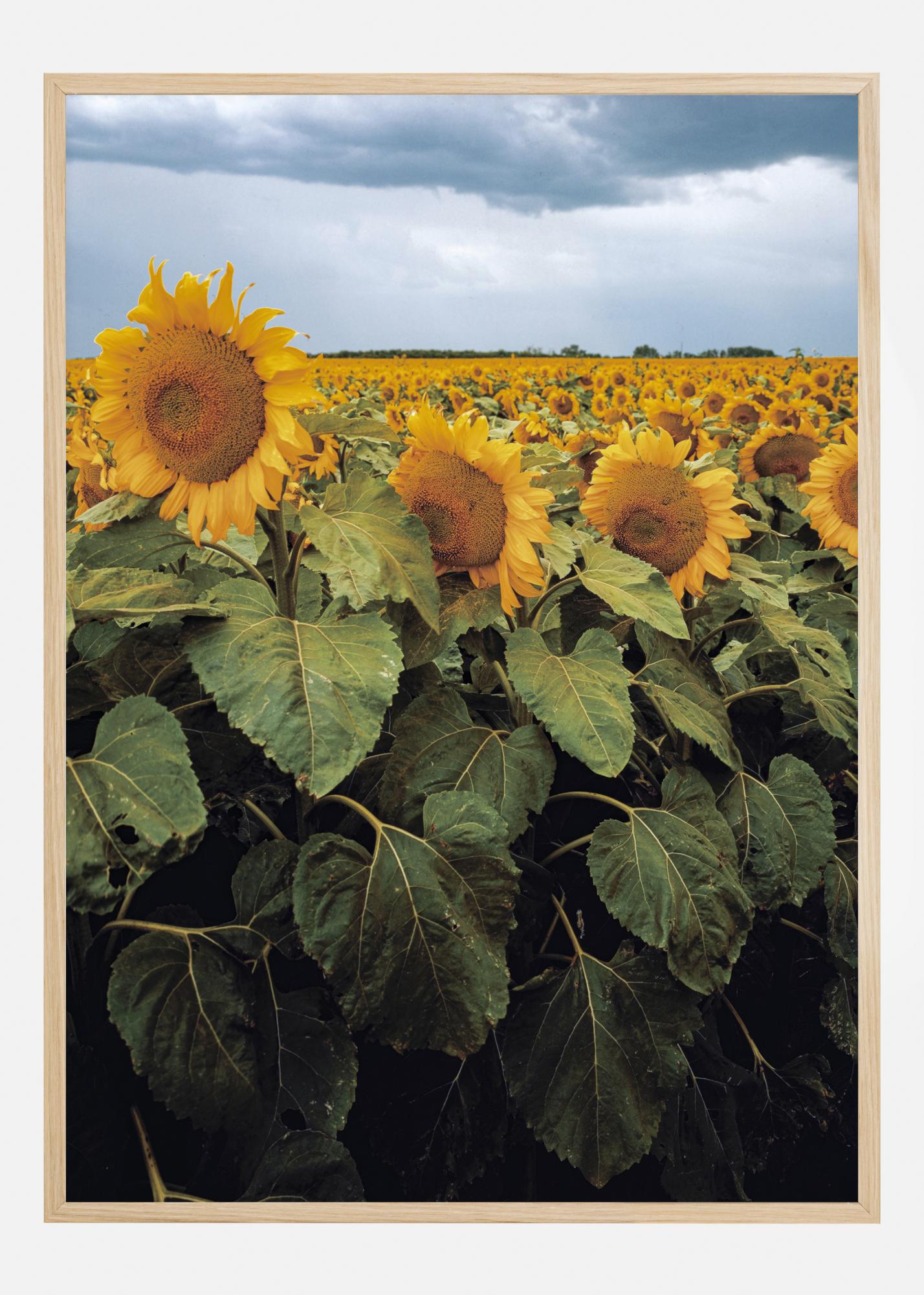 Oslnivý plagát s veľkým poľom slnečníc. Obraz je plný dlhých zelených stoniek a listov kvetov. Hore sa vznáša more svetložltých slnečníc, ktoré sa tiahnu do diaľky a modrej oblohy. Cíťte sa povznesene s touto veselou tlačou.