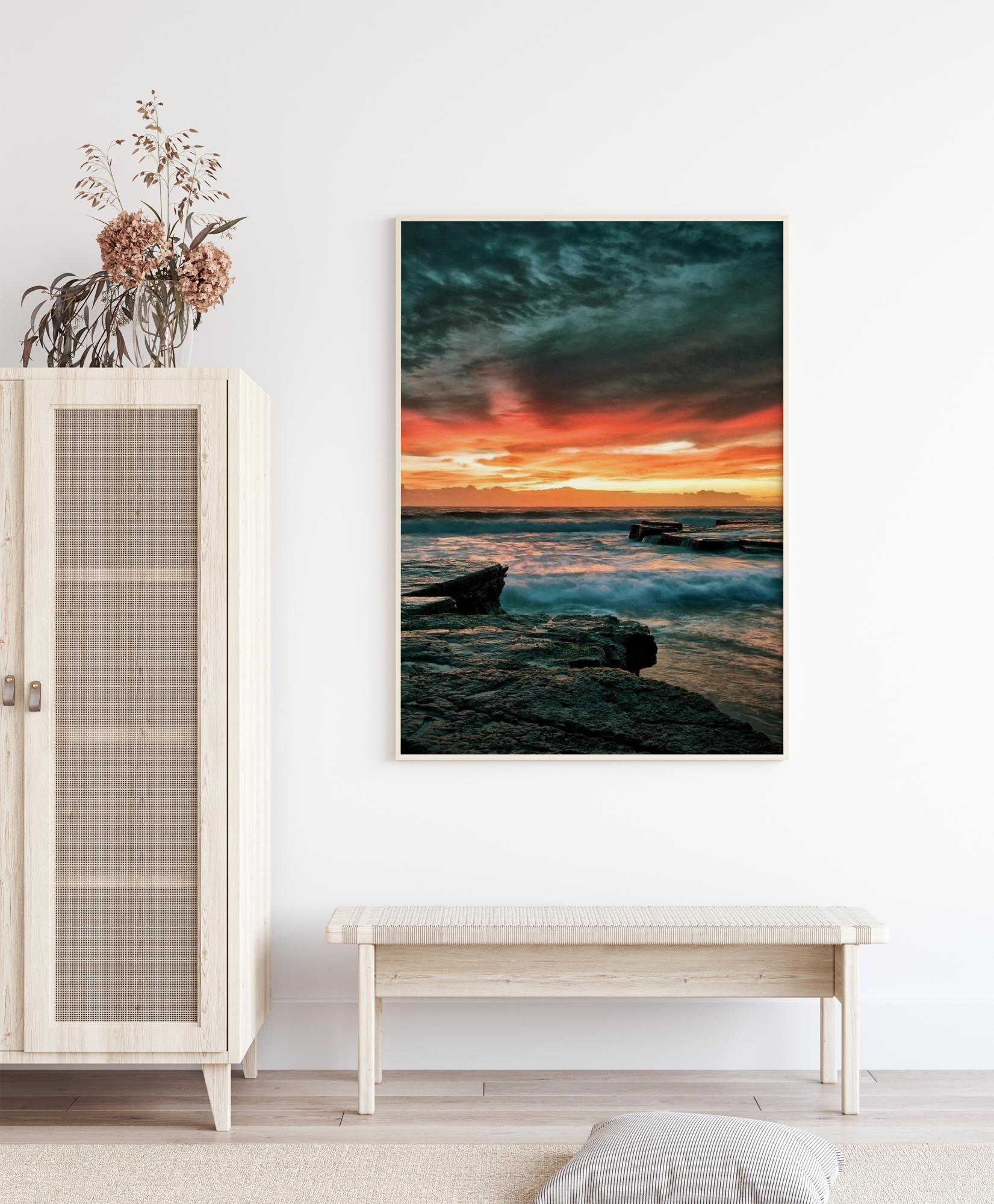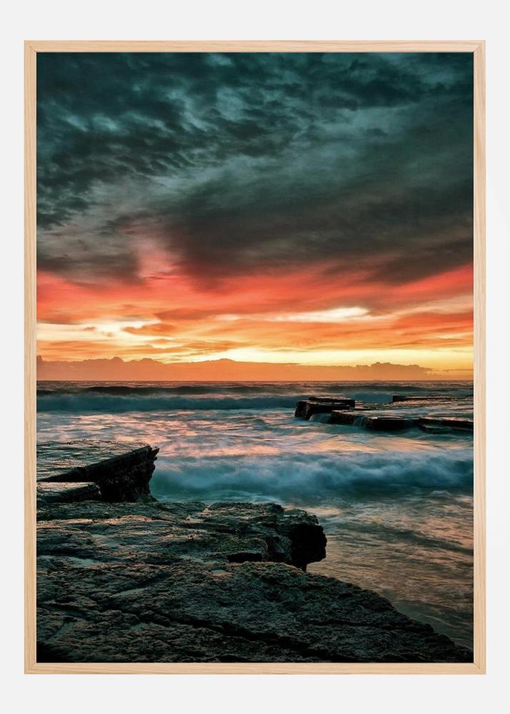 Epický plagát so západom slnka nad vodou. Vlny z mora narážajú na plochú skalnatú pláž. Tmavé oblaky ležia priamo nad nimi s jasne červeným západom slnka nízko na horizonte, čo vytvára dramatický a pôsobivý obraz, ktorý udrží vašu pozornosť.
