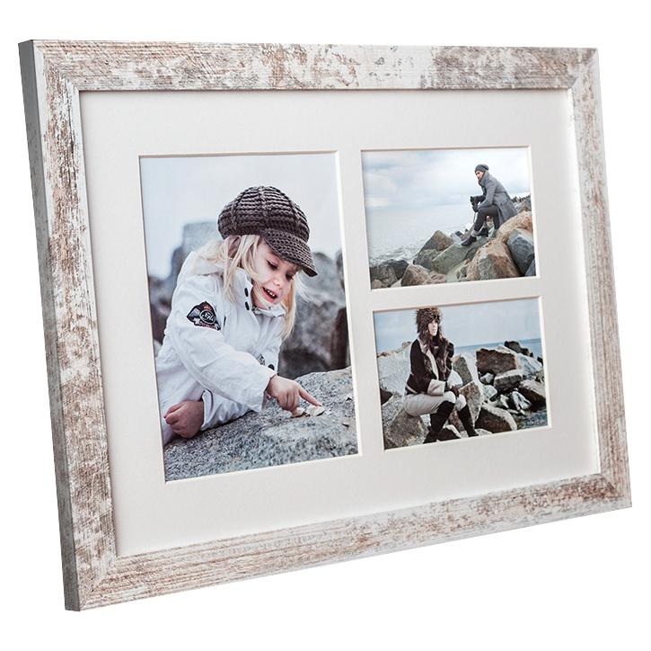 Elegantný vintage rám so širokým profilom a opotrebovaným vzhľadom v bielej a drevenej farbe. Dodáva vašim obrázkom ďalší rozmer a je ideálny, keď chcete dosiahnuť autentický vintage pocit. Rám na koláž má miesto pre 3 obrázky rôznych veľkostí.