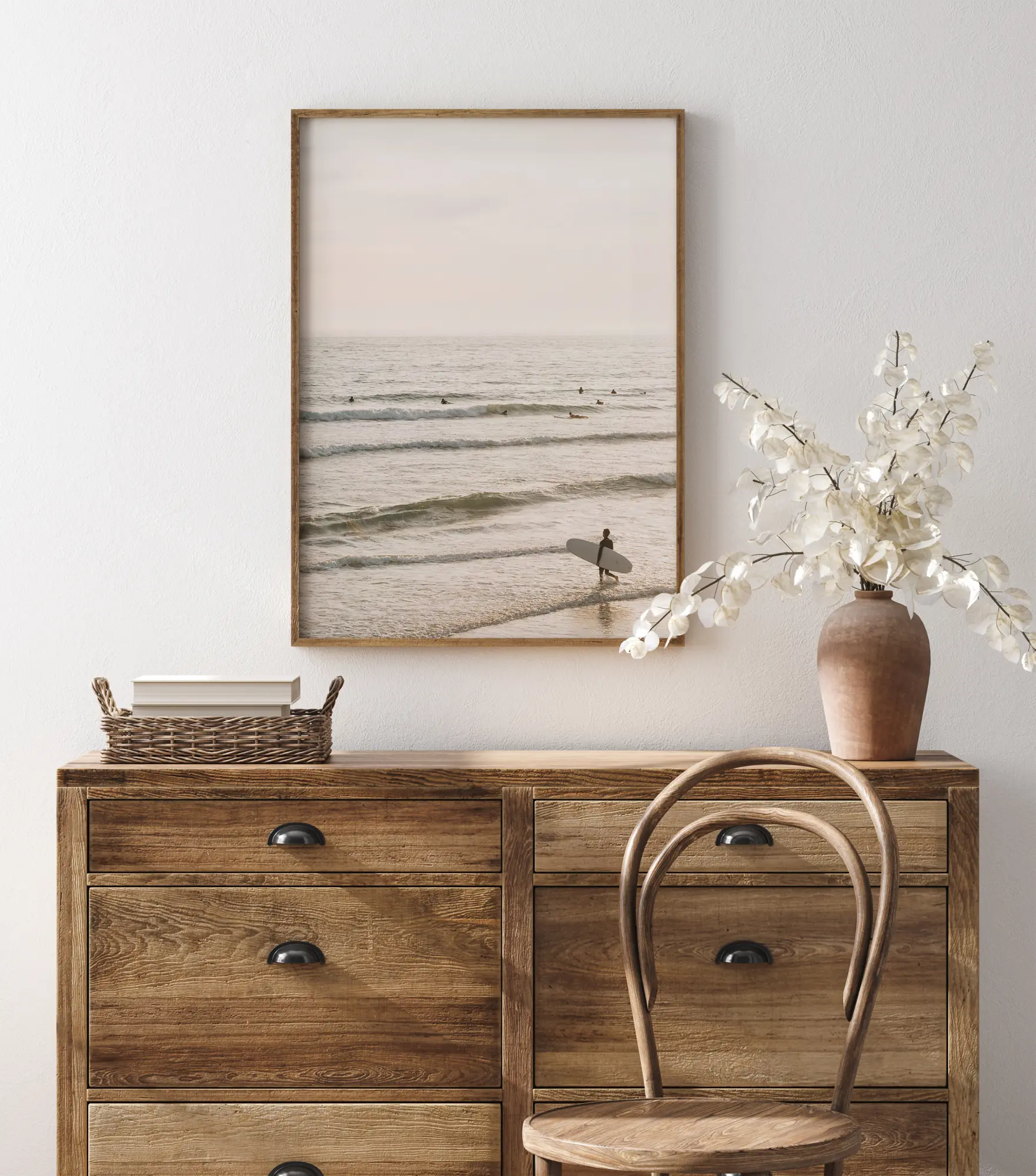 Plagát s rozľahlým morom plným surfistov, ktorí čakajú na ďalšiu veľkú vlnu. Malé hlavy sa kníšu ďaleko v mori a posledný surfista kráča medzi vlnami so svojou doskou. More je pokojné v jemnom rannom svetle a vo vzduchu je cítiť očakávanie.