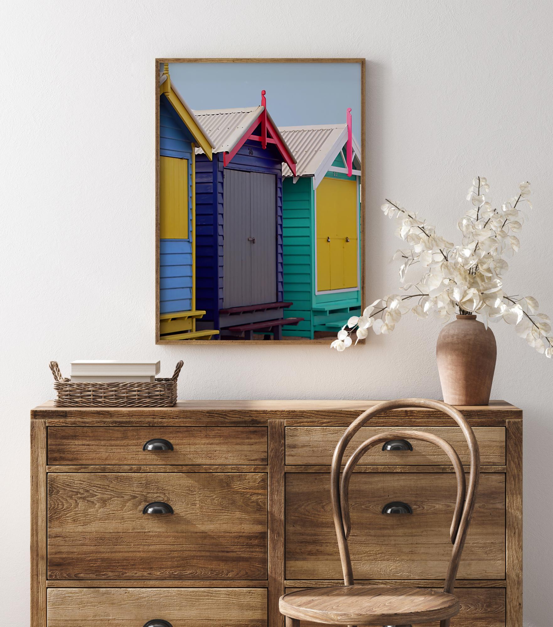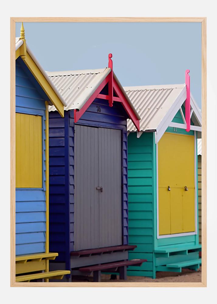 Svetlý plagát s farebnými plážovými chatkami. Každá chata je natretá v niekoľkých živých farbách, ako žltá, modrá, ružová a tyrkysová. Získajte letný plážový pocit, keď ju zavesíte na neutrálnu stenu a dodáte svojmu domovu farbu.