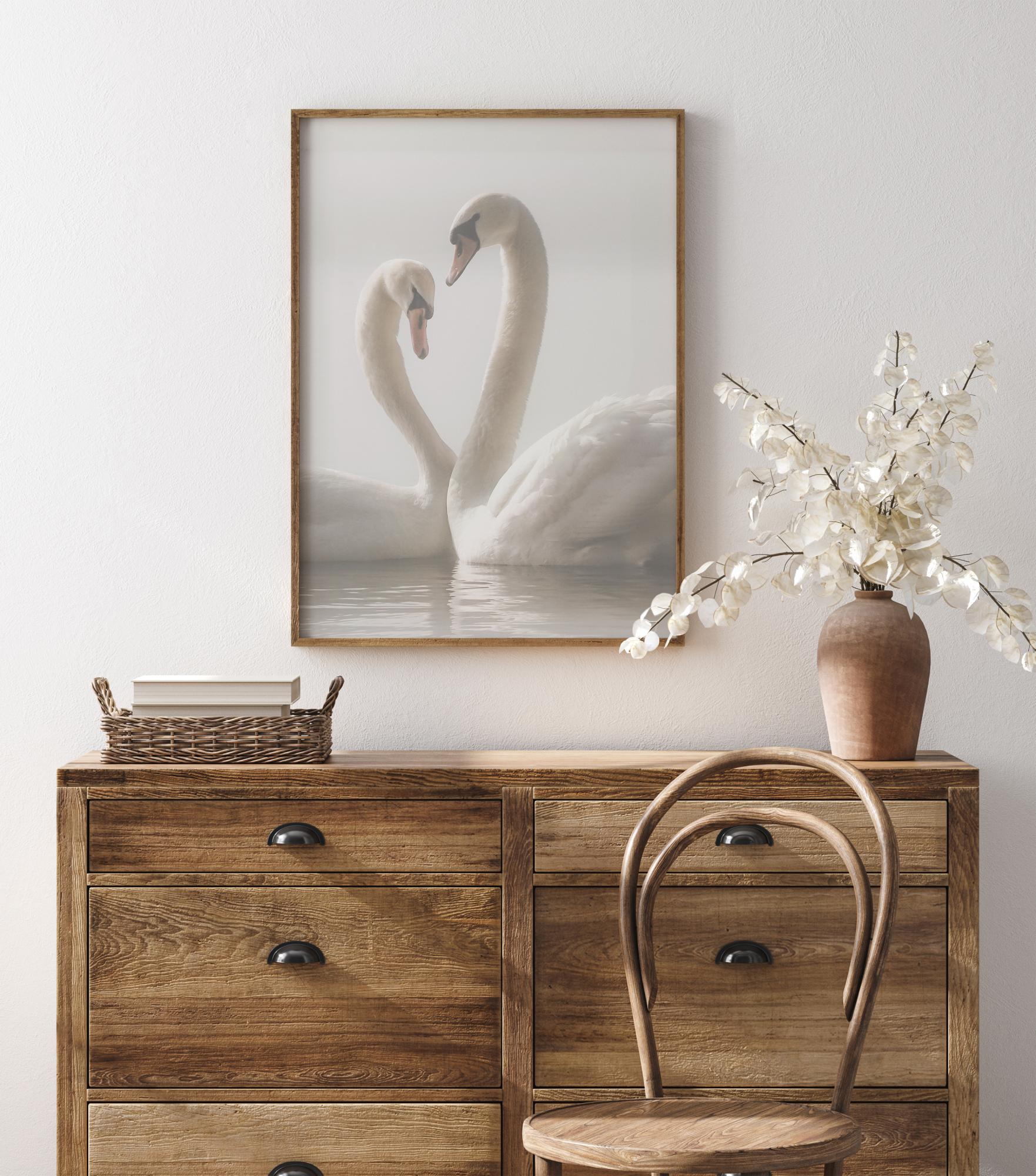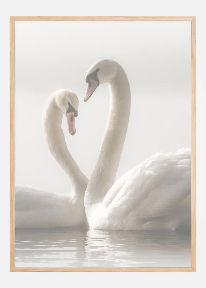Romantický plagát s dvomi labuťami, ktoré plávajú spolu. Jemné osvetlenie prináša harmonický pokoj tejto snímke, na ktorej sa labute kĺžu k sebe. Ich krky sa dvíhajú a tvoria tvar srdca. Pocíťte lásku na tejto očarujúcej fotografii.