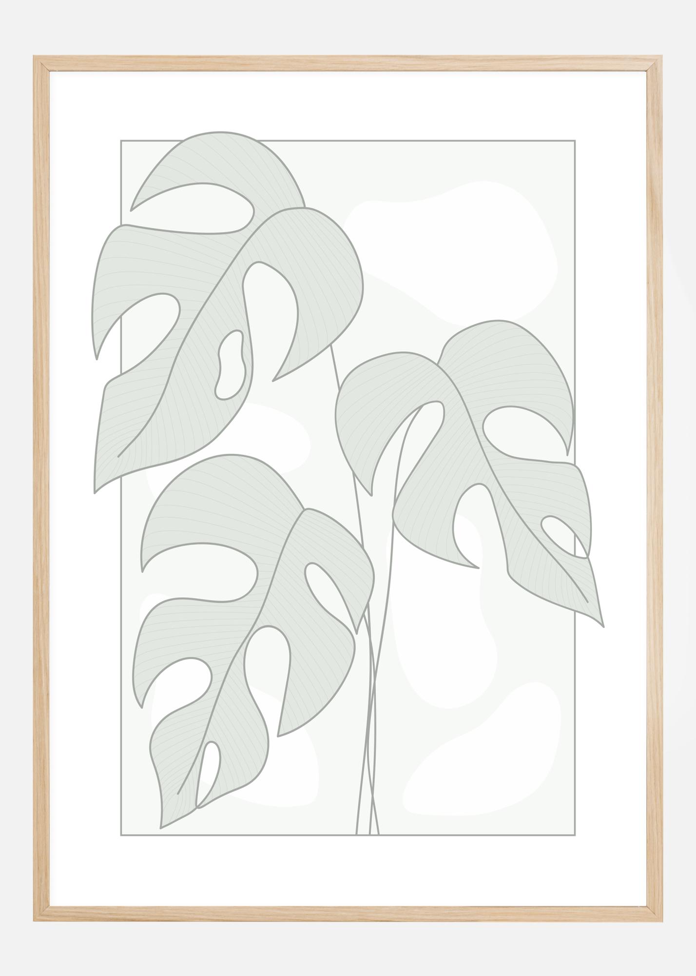 Jednoduchý plagát s ilustratívnymi listami monstery. Tri veľké listy vyplňujú obraz, každý v jemnom sivom odtieni. Tenké línie tvoria stonky, keď tieto elegantné listy s otvormi visia dole na tomto obrázku. Udržte to diskrétne tým, že ho zavesíte na jemne zelenú stenu pre pocit prírody.