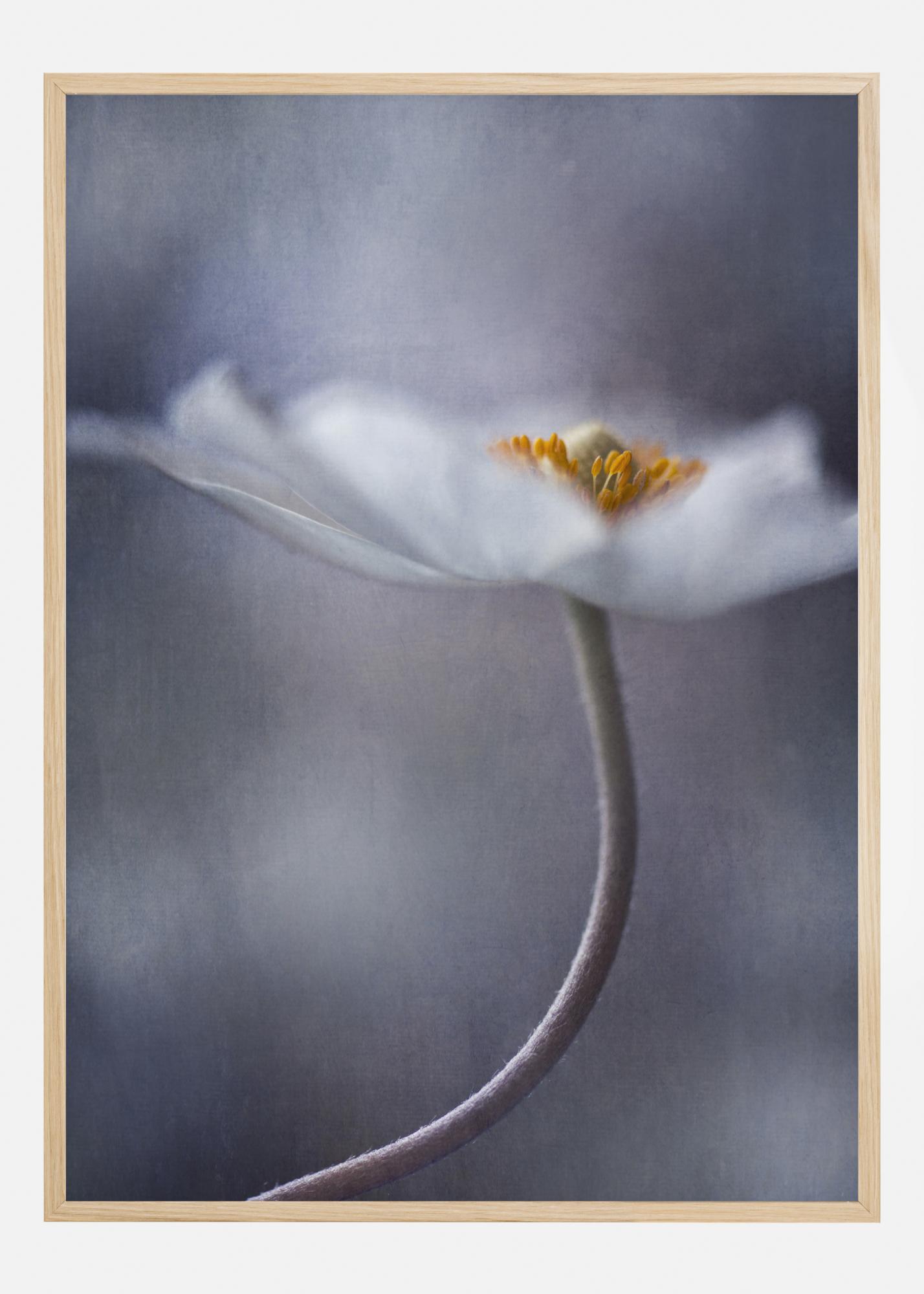 Plagát s kvetom s detailným záberom na biely kvet na mäkkom sivom pozadí. Oranžový stred kvetu vystupuje na tlmenom pozadí, čo vytvára jasný bod sústredenia a zdôrazňuje krásu kvetu aj vonkajšie prostredie. Je éterický a magický a vyžaruje pokoj.
