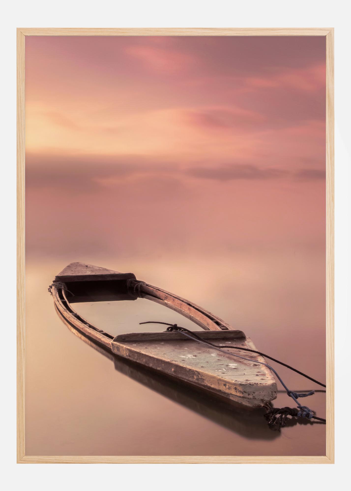 Pokojný plagát s drevenou loďou ležiacou v pokojnej vode. Voda a obloha majú jemné ružové a fialové pastelové farby. Postupne sa zlievajú, čo spôsobuje, že voda a obloha sa zlúčia a pokračujú navždy. Loď je jediným pevným objektom ako hlavný bod tejto jemnej, upokojujúcej fotografie.