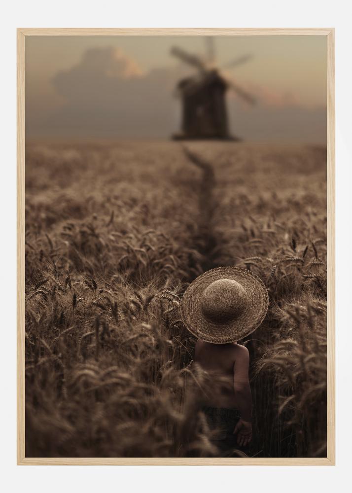 Portrétový plagát chlapca na pšeničnom poli s veterným mlynom v diaľke. Jemné žlté a ružové farby vytvárajú skutočne pokojný dojem. Odvážte sa k tomuto veternému mlynu spolu s chlapcom pomocou tohto obrázka.