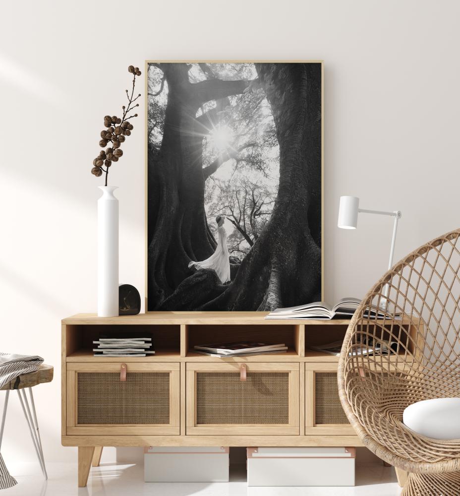 Úžasný plagát s prírodným motívom obrovských stromov, slnečného lúča a ženy stojacej medzi nimi. Svetelný lúč vás vtiahne do tejto mystickej fotografie. Dajte svojmu domovu pocit pokoja a ticha pomocou tohto obrázka.