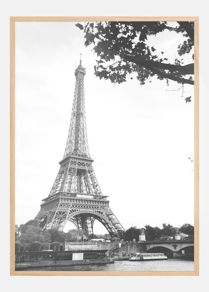 Plagát mesta s Eiffelovou vežou v Paríži. Sivá veža je jasne viditeľná proti bielej oblohe. Dole je vidieť život a ruch rieky s loďou a mostom. Vetva stromu takmer zakrýva vrchol veže na tomto jednoduchom, prirodzenom obrázku tohto ikonického monumentu.