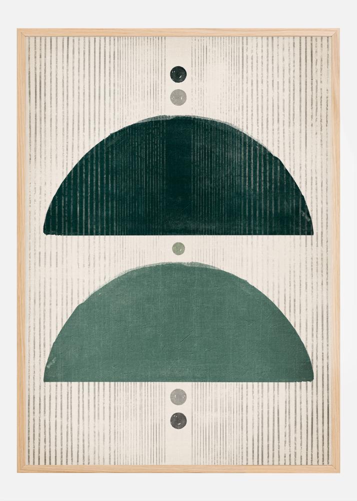 Tento plagát je viac než len dekoratívny obraz; je to súčasná umelecká interpretácia, ktorá spája prirodzenosť so štýlizáciou. Tri kruhové tvary, sústredené medzi polkruhovými blokmi, fungujú ako stredobod, ktorý zjednocuje celú kompozíciu. Tento výtlačok by mohol slúžiť ako elegantný prvok na stene v minimalistickom dome alebo kancelárii a upokojujúce zelené tóny by dodali pocit prírody a pokoja akejkoľvek atmosfére.