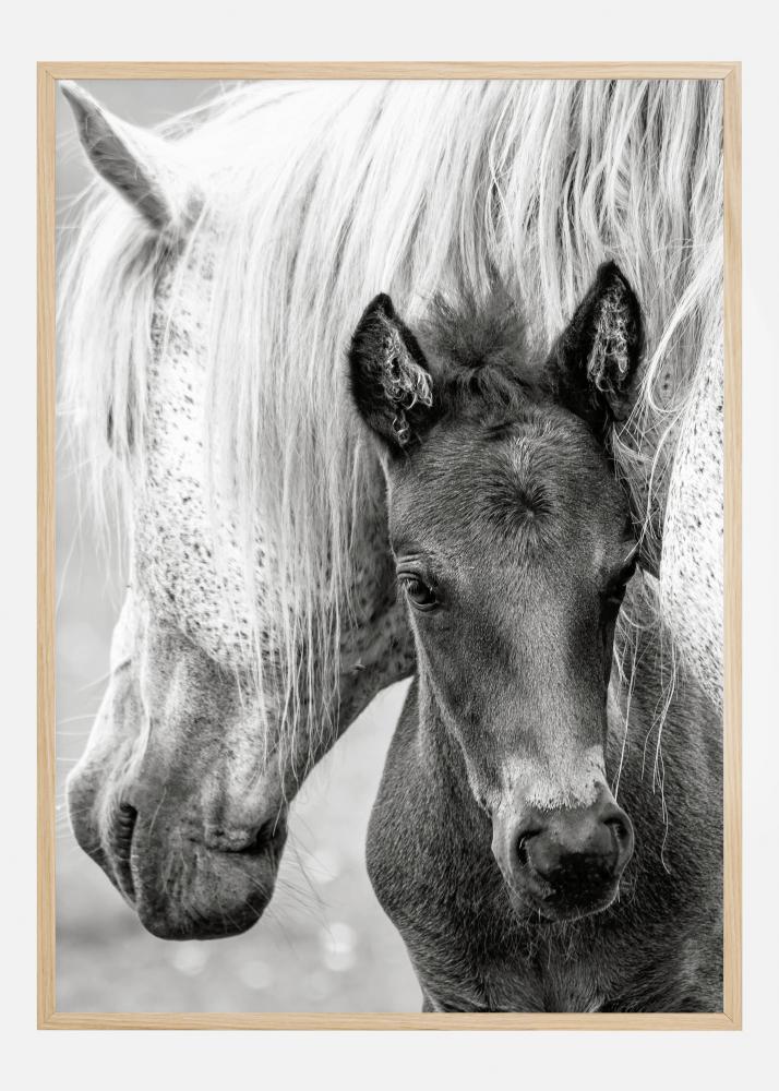 Plagát so zvieratami s kobylou a jej žriebäťom. Kobyla chráni svoje žriebä a opiera svoju bielu hlavu o jeho chrbát. Tmavo sfarbené žriebä sa z tohto úkrytu pozerá na kameru s ušami vztýčenými zo zvedavosti. Užite si tento roztomilý obrázok bábätka.