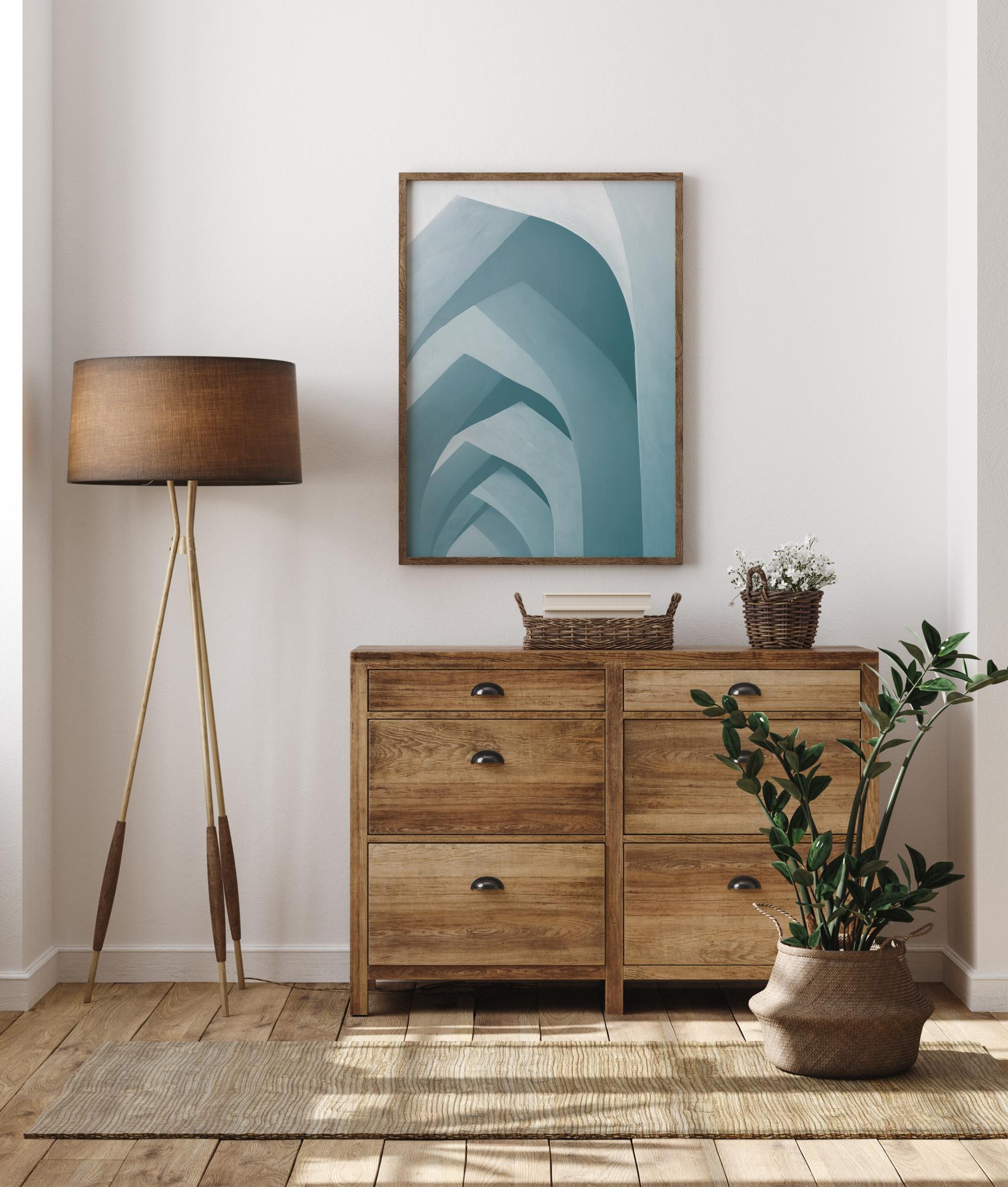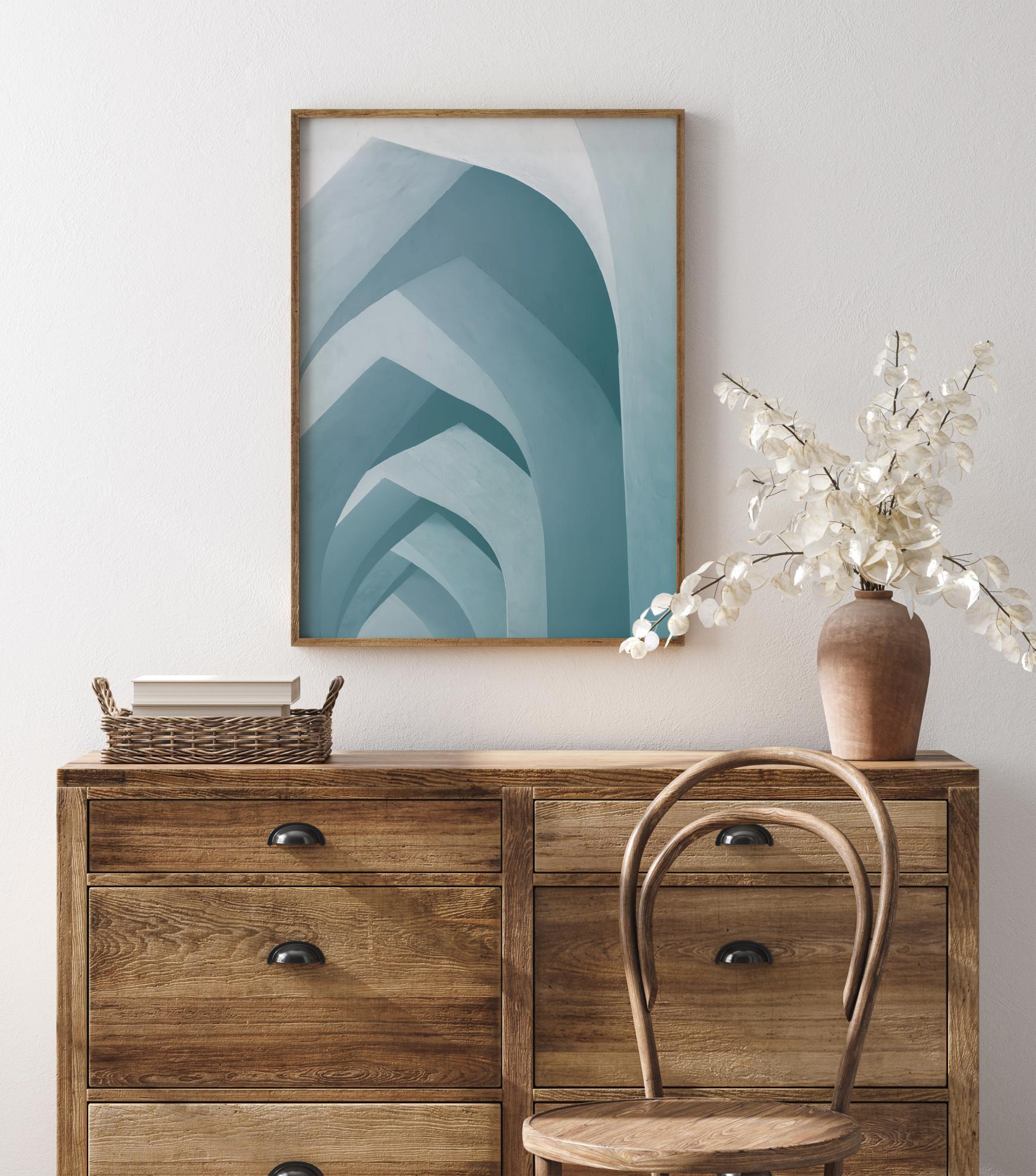 Grafický plagát s rôznymi tvarmi, ktoré vytvárajú oblúky. Každý oblúkový tvar je vytvorený pomocou blokových farieb v rôznych modrých odtieňoch. Tmavé a svetlé farby sú postavené proti sebe, aby vytvorili ilúziu hĺbky a pocit dlhej chodby. Zaveste ho na bielu stenu, aby ste zvýšili kontrast farieb.